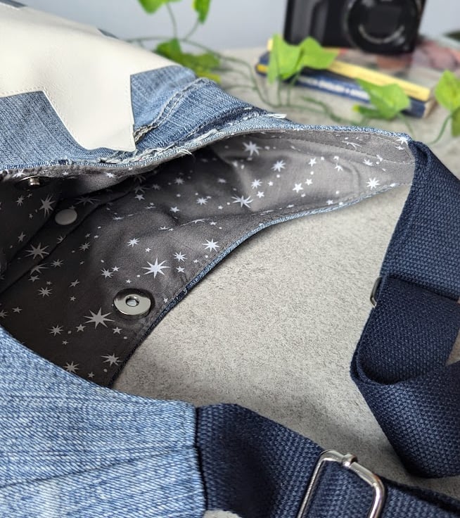 The star theme is carried through with a grey and white star print print poly-cotton lining. The cross body strap has been made from 38mm wide navy webbing.
