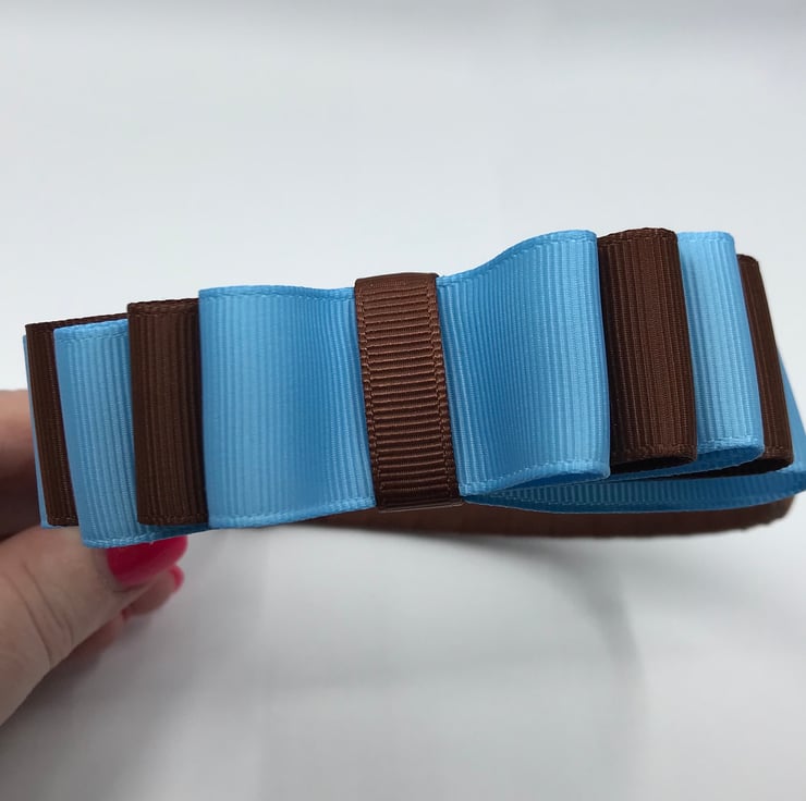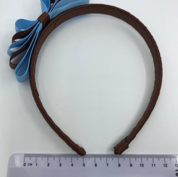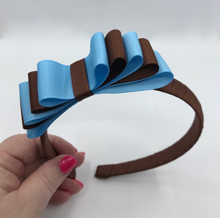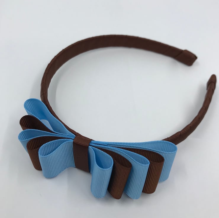 Brown Hairband with 5 Layer Brown and Light Blue Two-tone Straight Bow