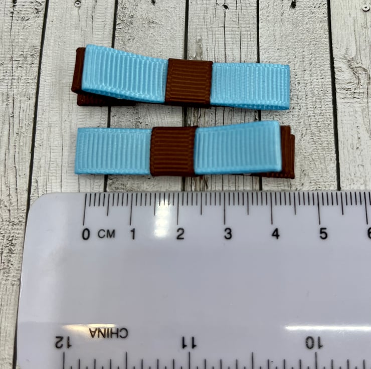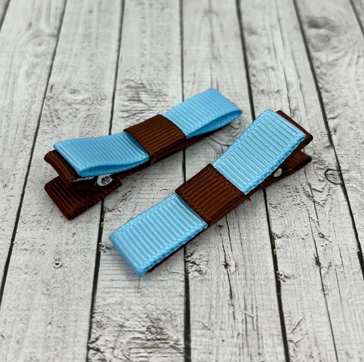 Our Small Straight clips are handmade here in our little shop. They are so cute and compliment any school Uniform with brown and light blue in it. They are ideal for keeping those sneaky little curls from straying into your little one's eyes.