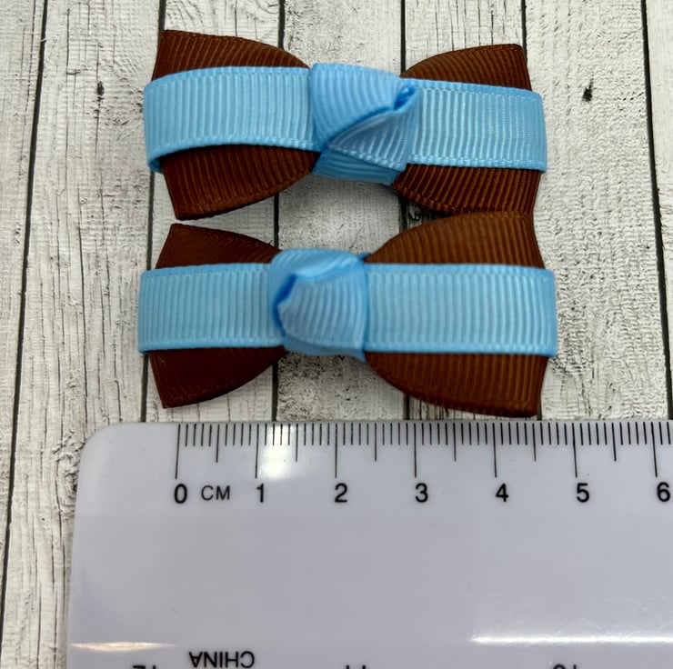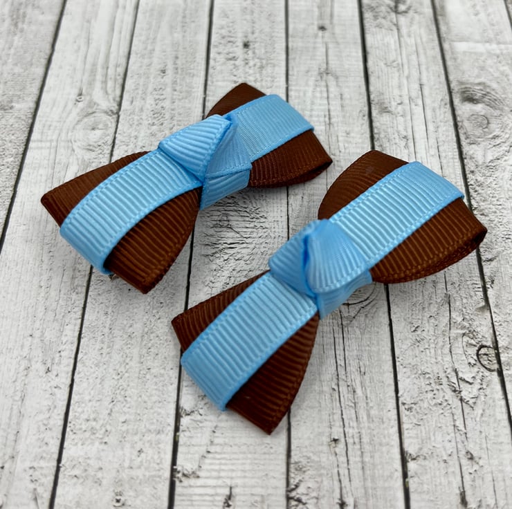 Our Itty Bitty clips are handmade here in our little shop. They are so cute and compliment any school Uniform with brown and light blue in it. They are ideal for keeping those sneaky little curls from straying into your little one's eyes.