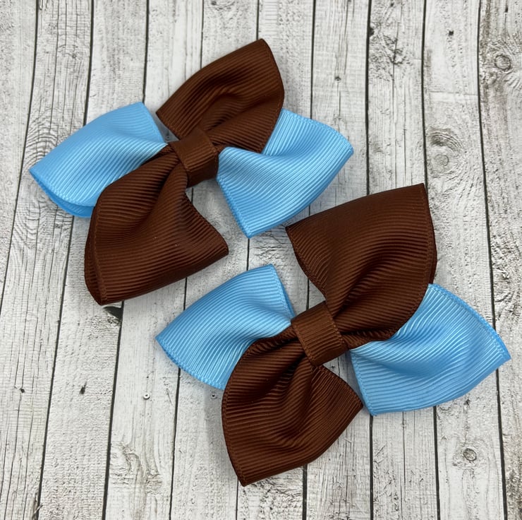 Our square double bows are handmade here in our little shop. They are made from the best quality Grosgrain ribbon. These bows are simple and classic and look extremely smart and go well with the brown and light blue School Uniform.