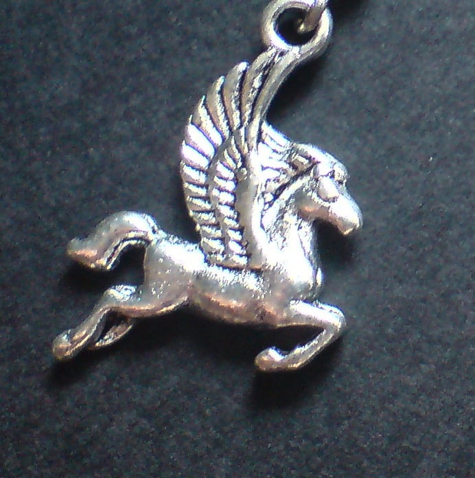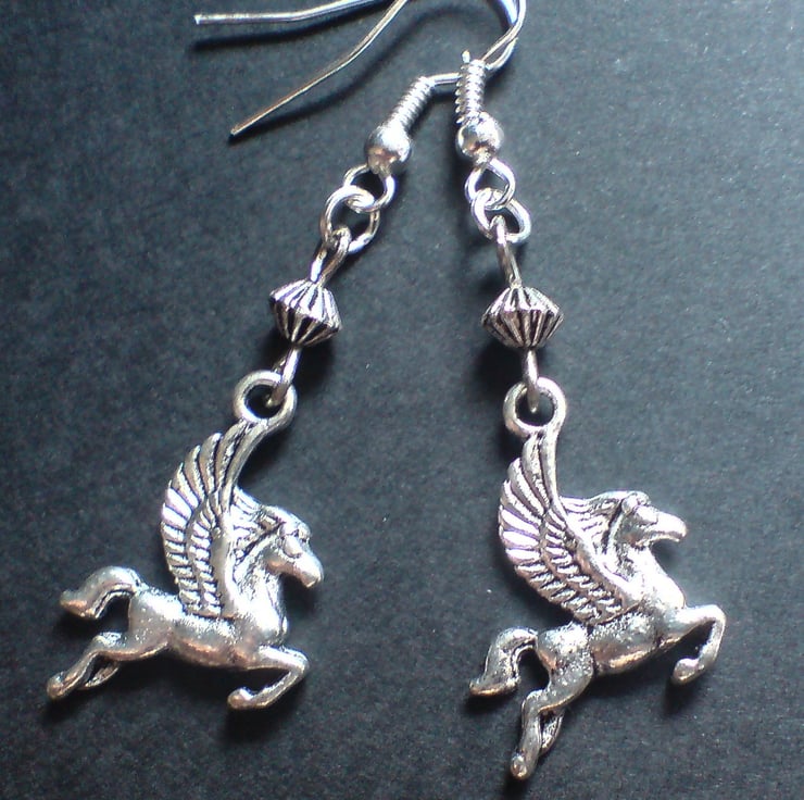 These beautiful earrings have flying Pegasus charms hanging on silver plate hooks.