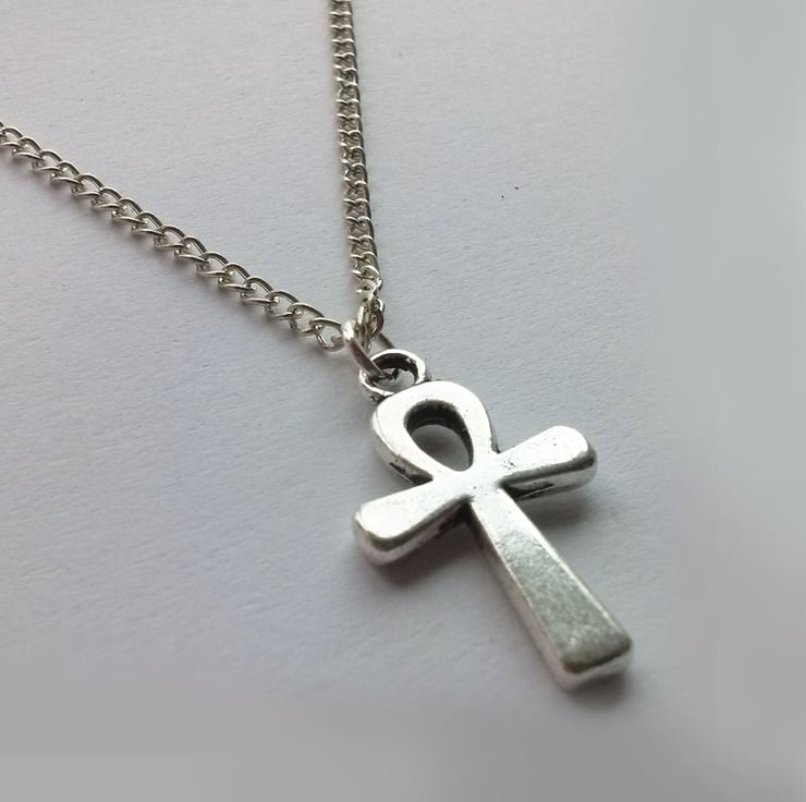 This nice necklace has an ankh charm on 18" silver plate chain.