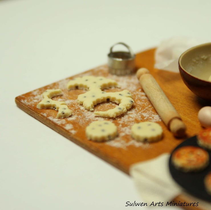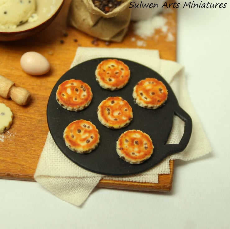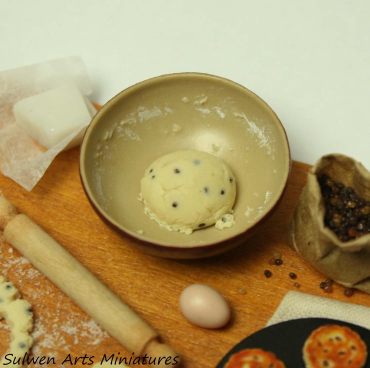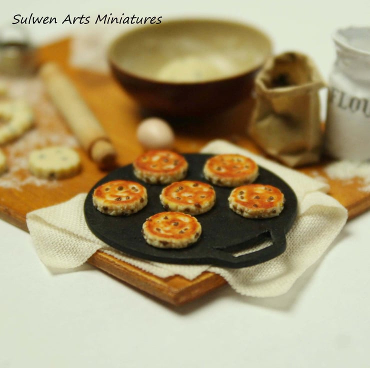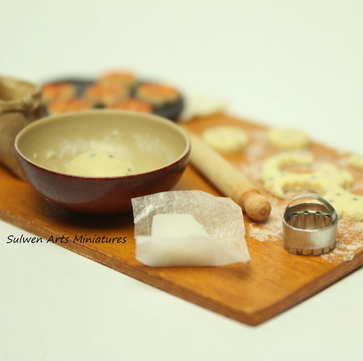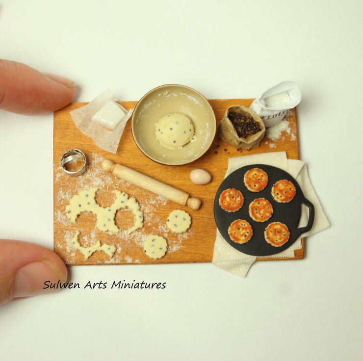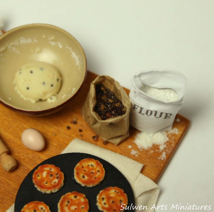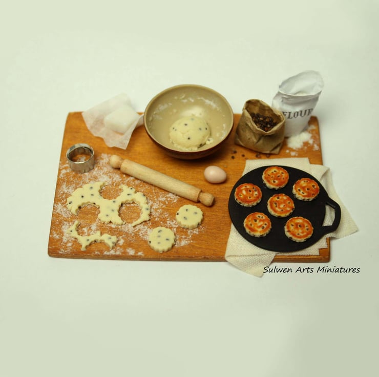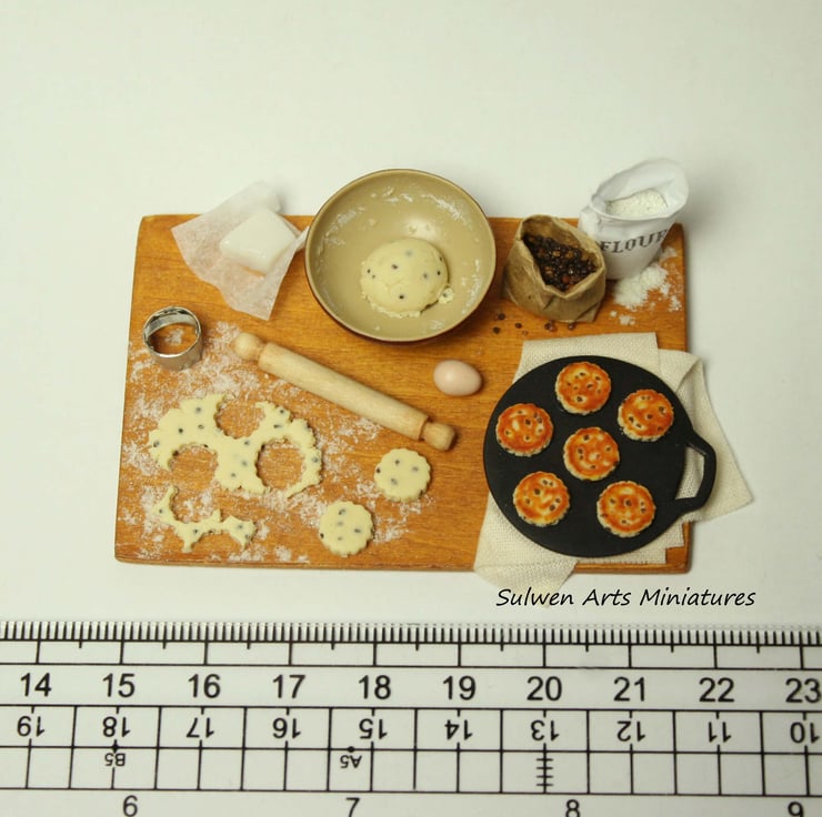When I first started making jewellery I gained a bit of notoriety as "the welsh cake earrings lady" and so I thought it appropriate, now that I am making dollhouse miniatures, to make a welsh cake baking scene. The welsh do love their welsh cakes! It has been really interesting to delve into the history of the welsh cake, bakestones and even what people used to use before mass produced packaging was a thing! One of the awesome unintended side effects of making miniatures is the diverse range of knowledge and skills you can pick up simply from the need to reproduce something accurately.