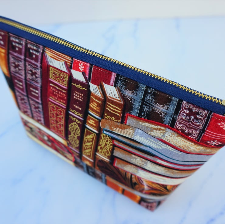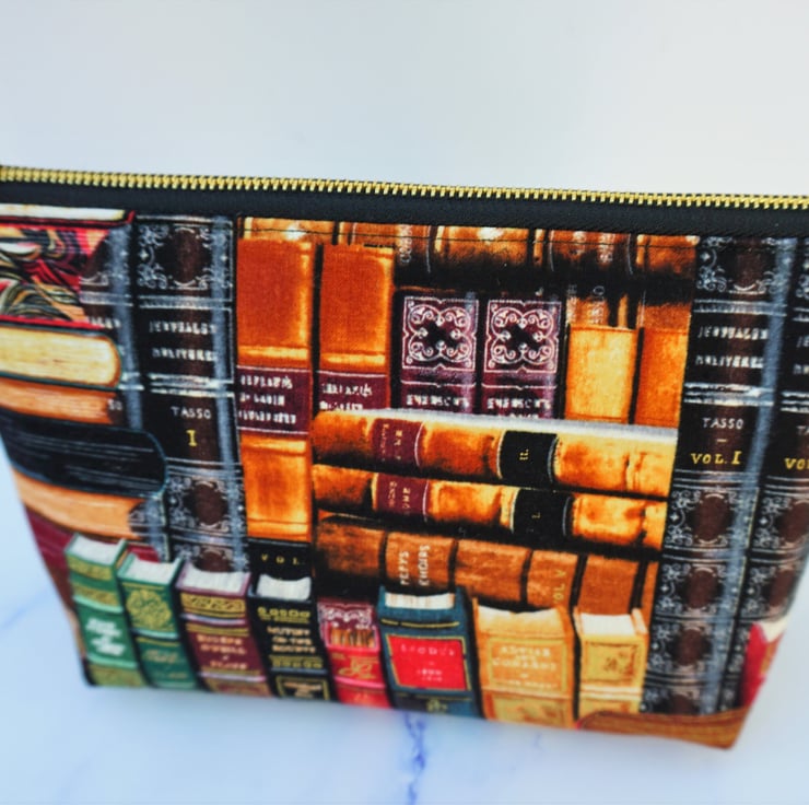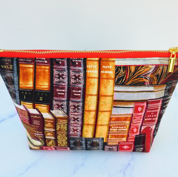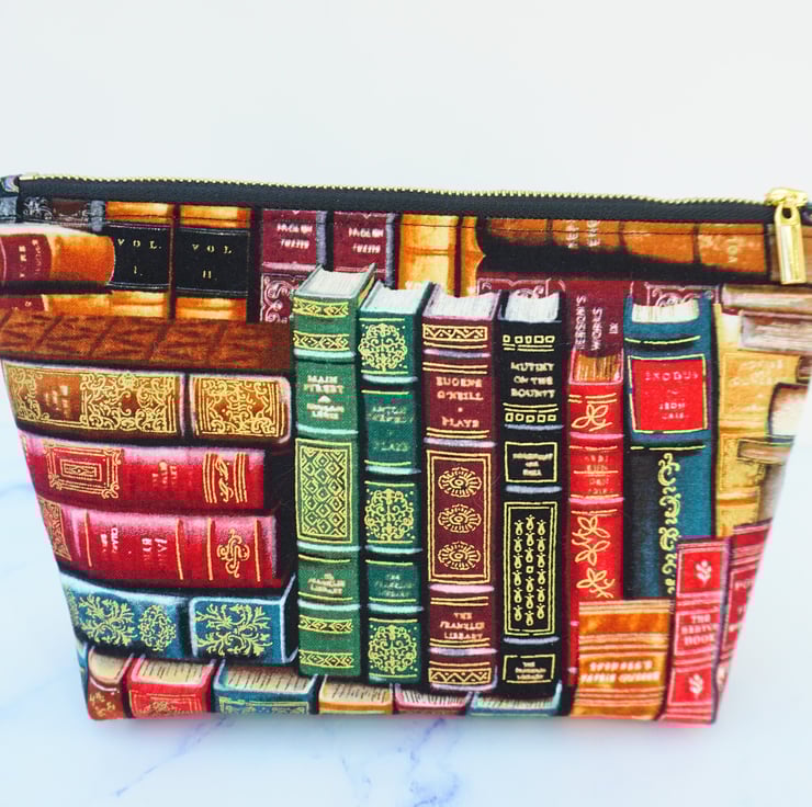 Here is a cute little purse made from fabulous book themed fabric in shades of rich reds, greens and gold. There is a gold coloured metal zipper at the top finished off with the added touch of a fabric end tab. This lovely purse can be used for cosmetics or as a pencil case or even a large coin purse.