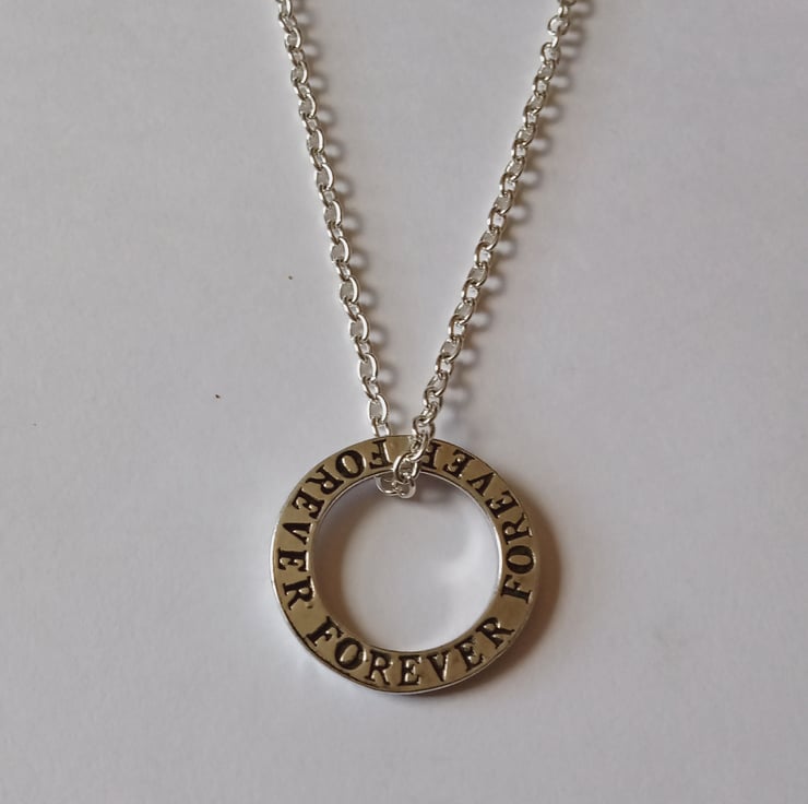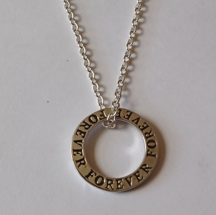 This stunning necklace has a large ring pendant which reads 'FOREVER' hanging on 26" silver plate chain.