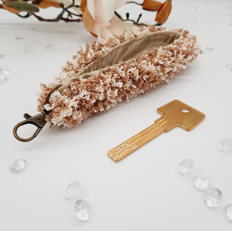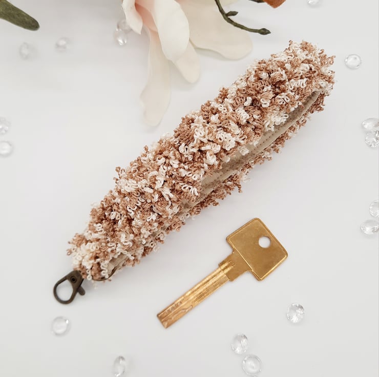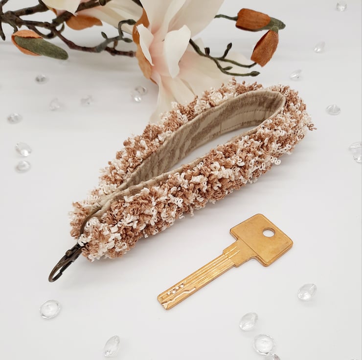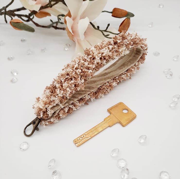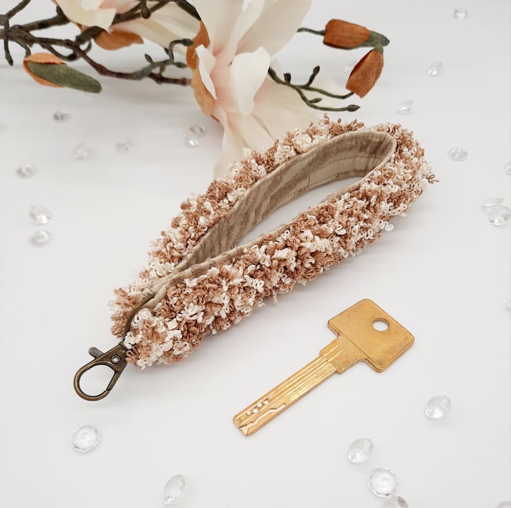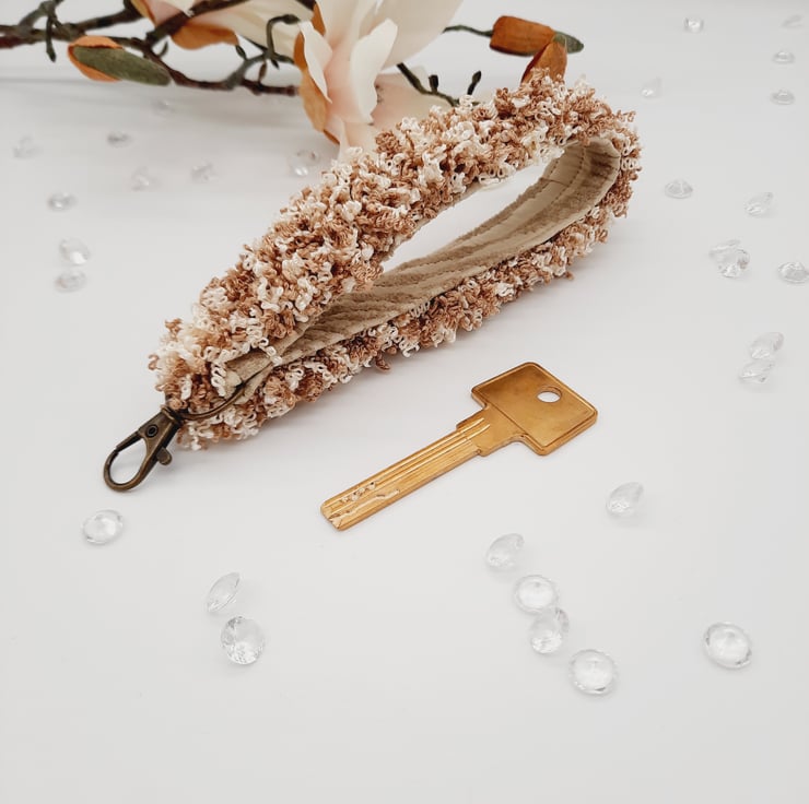 This fun wristlet keyfob is made from a beige cotton topped with a curly cream and light brown trimming.