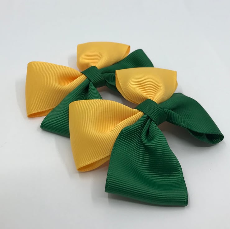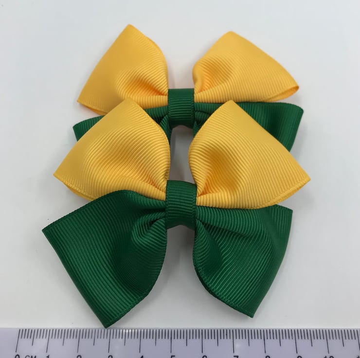 Our two tone double bows are handmade here in our little shop. They are made from the best quality Grosgrain ribbon. These bows are simple and classic and look extremely smart and go well with the forest green and yellow gold School Uniform.