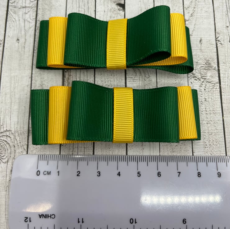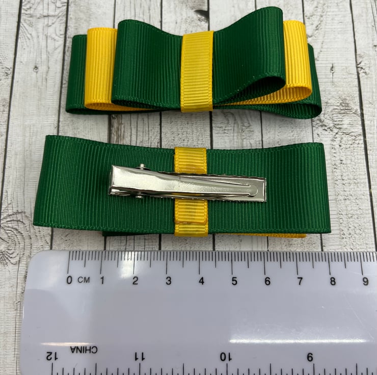 Our straight bows are handmade here in our little shop. They are made from the best quality Grosgrain ribbon. These bows are simple and classic and look extremely smart and go well with the forest green and yellow gold School Uniform.