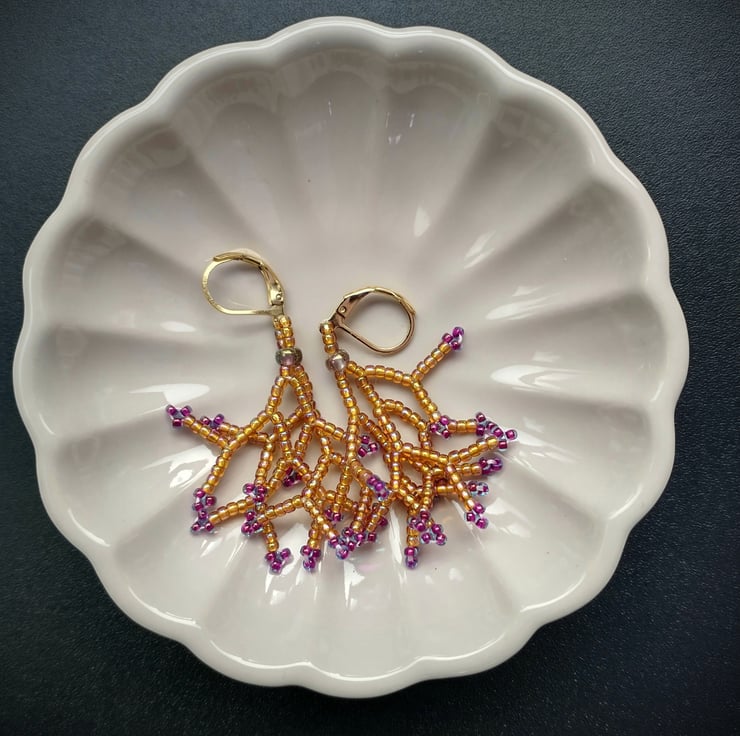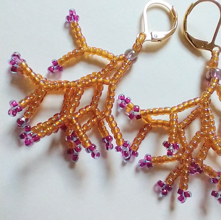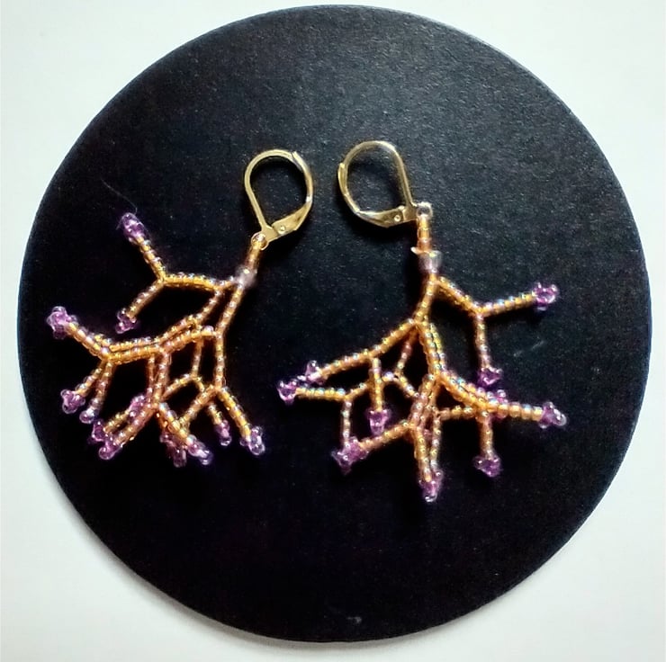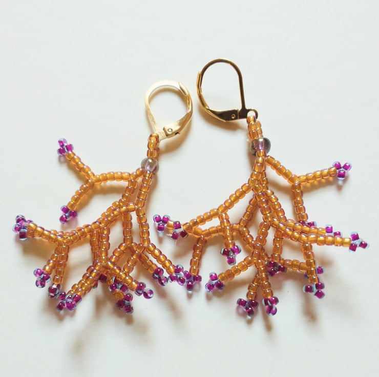 Gorgeous golden glass seeds beads and purple accent beads combine in these glamorous earrings. Effortlessly add a bit of luxe to your look! Made with high quality beading thread these earrings have a defined structure to them and maintain a three dimensional shape when worn. Stylish and eye-catching!