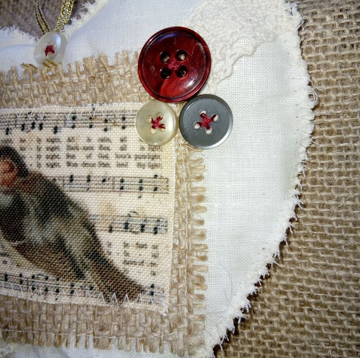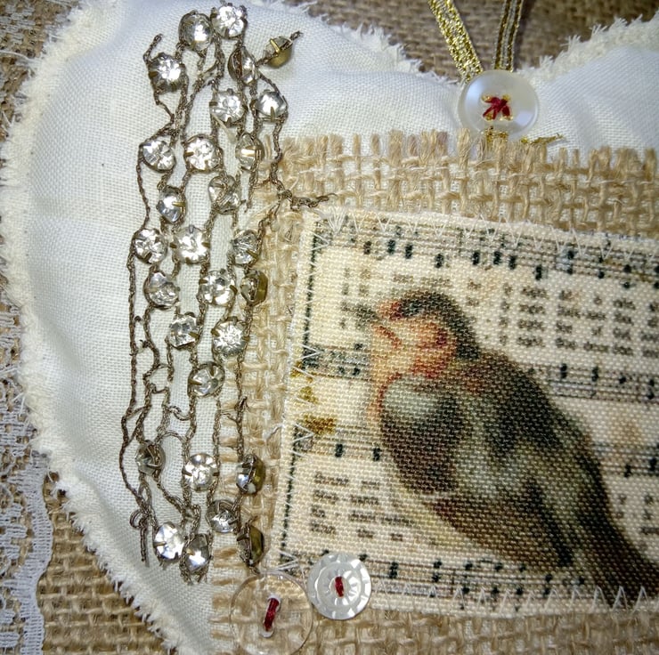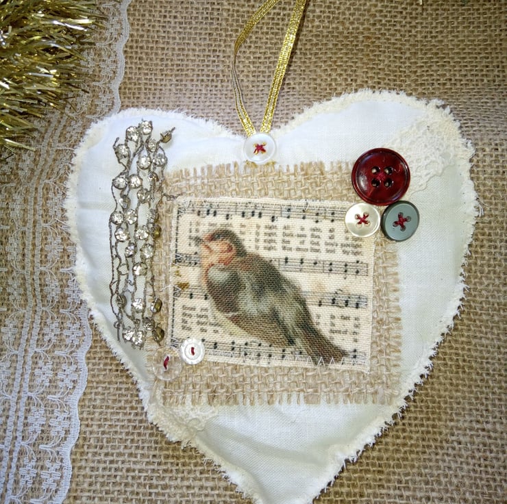 I love to use photo editing to create fabric with images on. I have created a fabric patch with a musical background and a beautiful robin as the focal point of this 14cm heart.