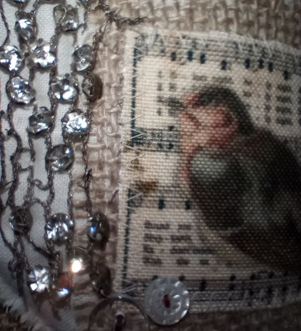 The front is made of an off white calico and features hessian, red grey and white buttons, a robin image and a strand of vintage diamantes, all added by machine or hand sewing.
