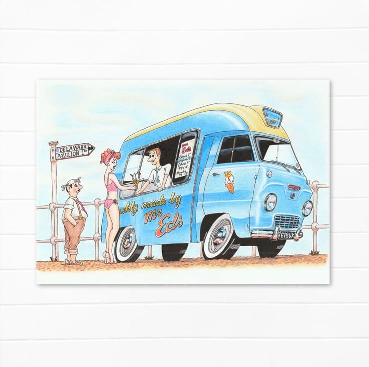 An original art greeting card featuring a hand-drawn pencil illustration of a cold ice cream on a hot day by the sea, hand drawn in black ink and coloured pencils.