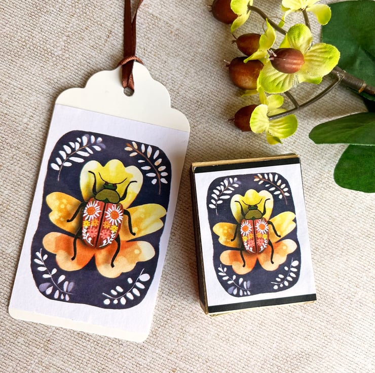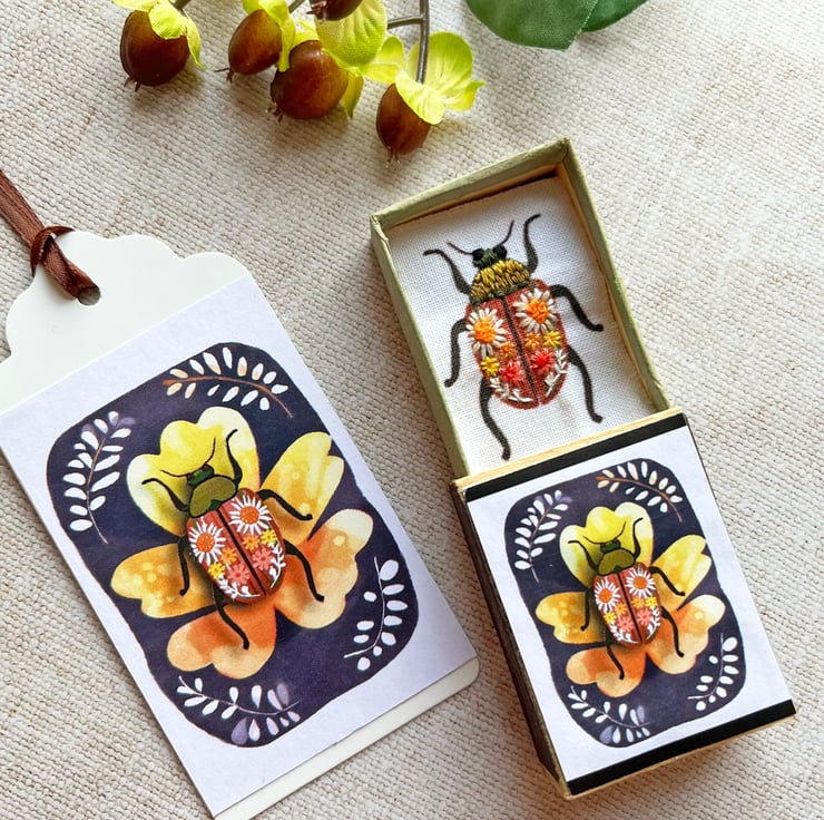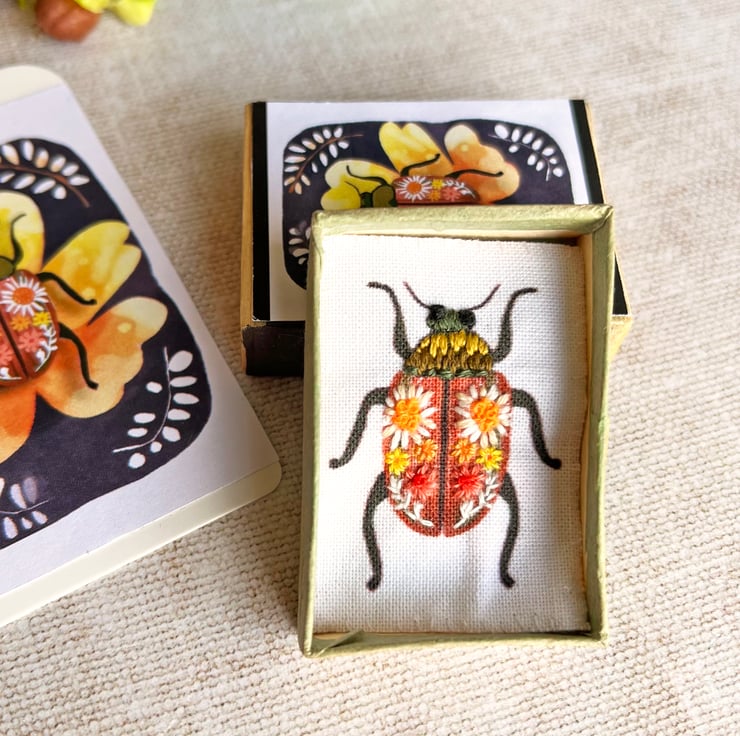 This pretty bug in a box would make a quirky little gift or keepsake. It has been made using an upcycled vintage matchbox and inside is a textile print of a beetle which I've embroidered with tiny flowers.