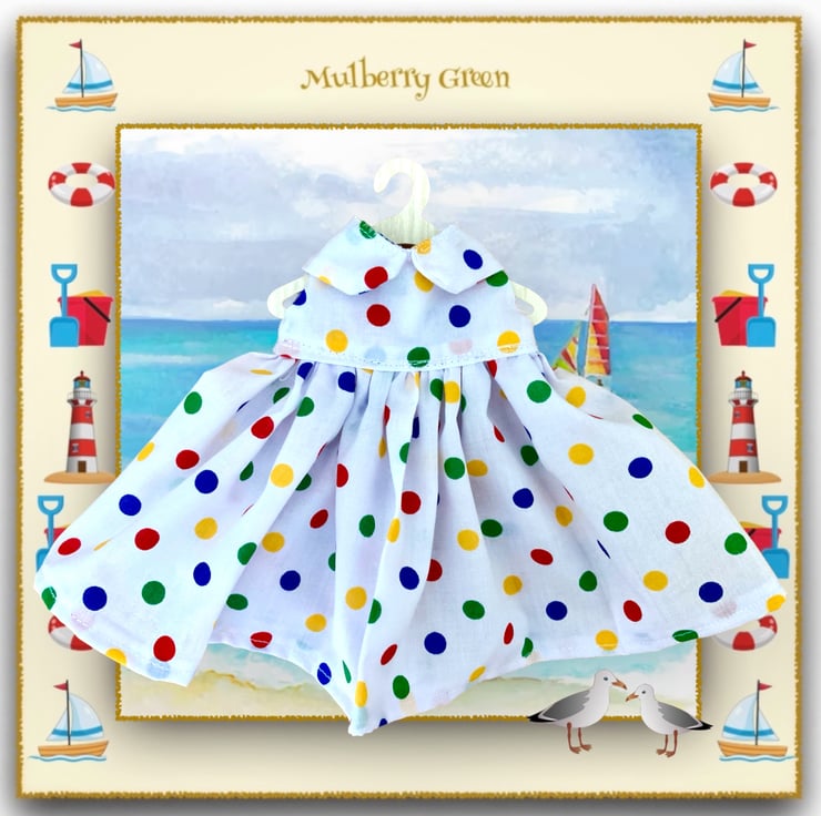 A sweet little dress in a spotty dotty print, to fit the Mulberry Green characters. The dress has a Peter Pan collar and a lined bodice. Perfect for the seaside.