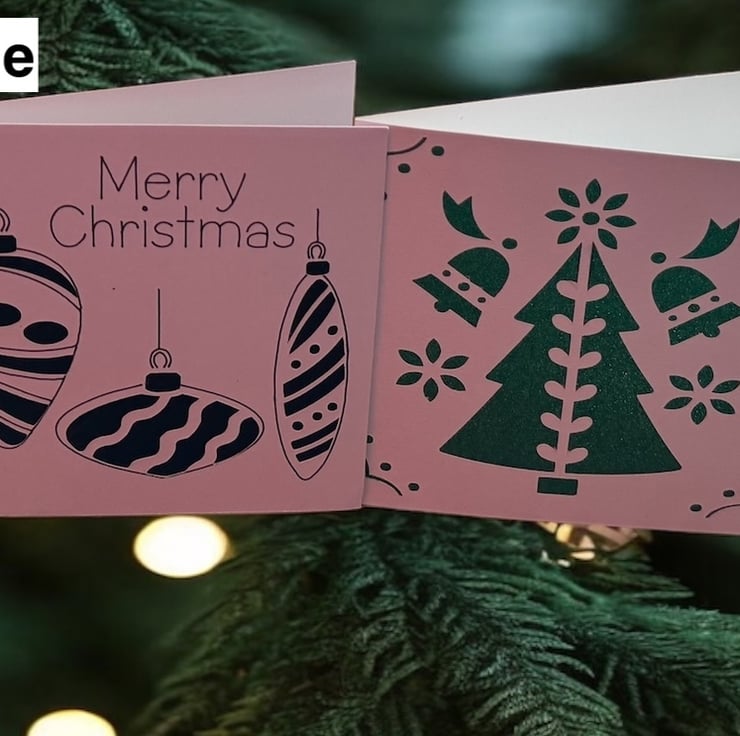 A pack of four lovely 12cm x12cm Handmade glittery Christmas cards, each featuring a different Christmas picture.