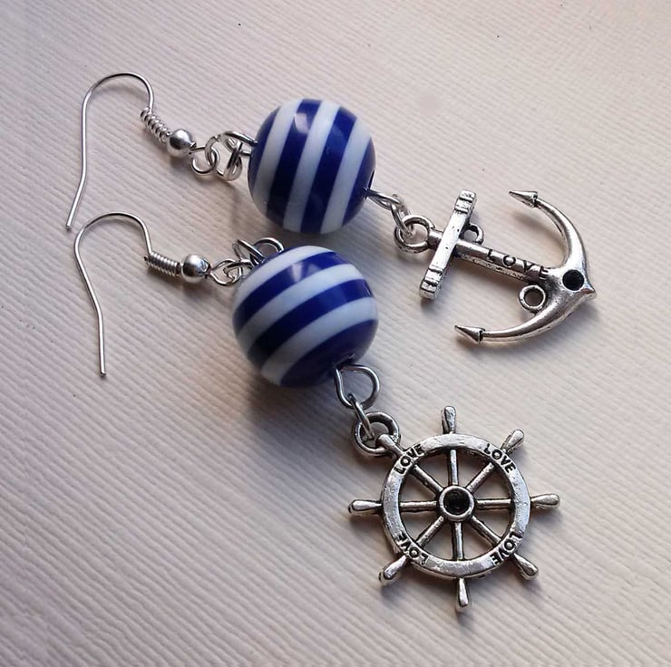 These nice earrings have mismatched anchor and ships wheel charms which say 'love' on hanging with white and blue striped beads on silver plate hooks.
