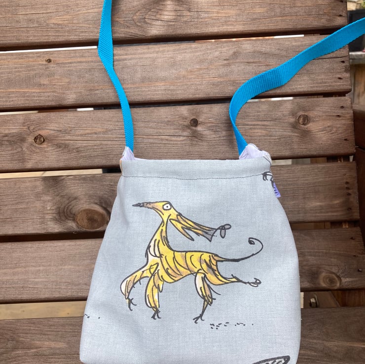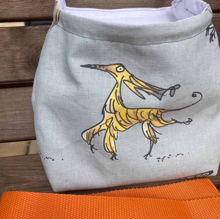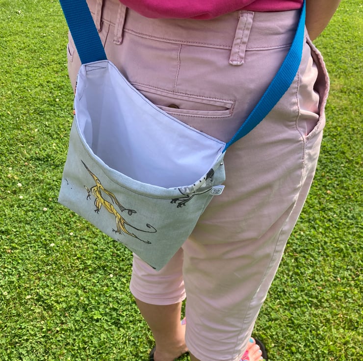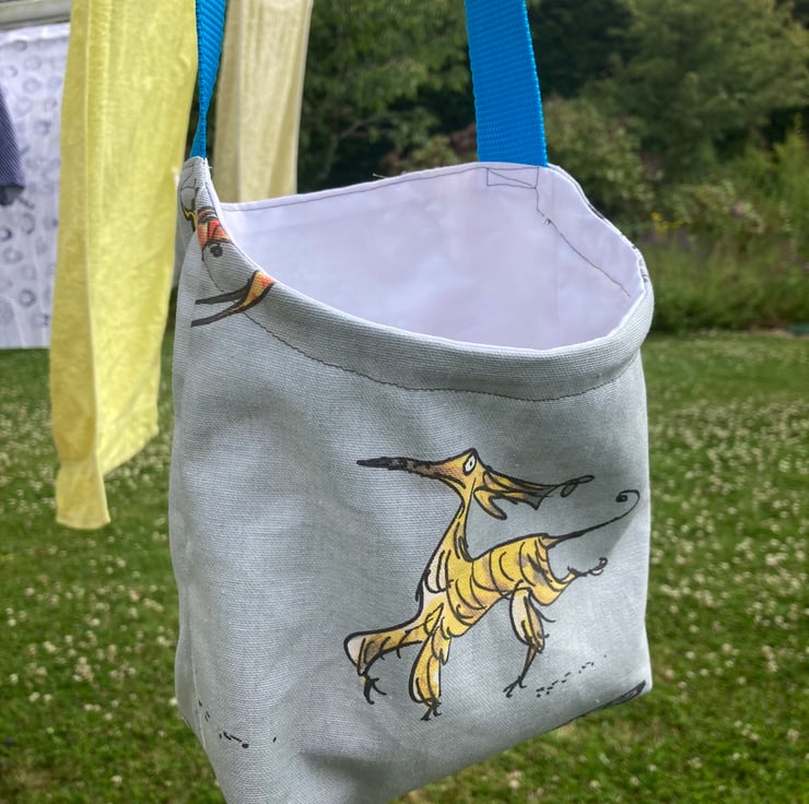We all know that line-drying is the most environmentally friendly way of getting the washing dry and this peg bag adds convenience to that simple pleasure. This quirky bag is something different. It is made from strong blue/grey cotton fabric decorated with cartoon dogs. They look like they are enjoying a good run-around. The bag is lined with plain white cotton fabric and the long, over-the-shoulder strap is turquoise blue.