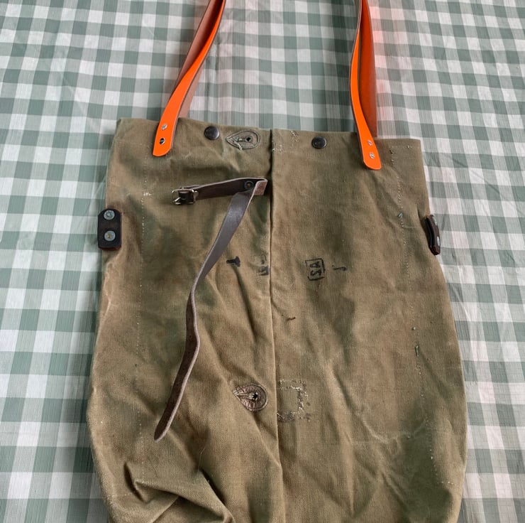 ntroducing our Upcycled Army Haversack with Hand-Cut Leather Straps, a fusion of military heritage and artisanal craftsmanship. Each haversack begins its journey as a robust, vintage army bag, handpicked for its history and durability. These bags are then meticulously transformed, with the addition of hand-cut leather straps made from reclaimed leather, offering a touch of rugged elegance and enhanced functionality.Every strap is carefully measured, cut, and stitched by hand, ensuring a secure fit and superior strength. The rich, textured leather complements the rugged fabric of the haversack, creating a distinctive contrast that speaks to both durability and style. Since each haversack is individually crafted, no two bags are exactly alike, making every piece a unique testament to sustainability and creativity.Perfect for outdoor enthusiasts, urban explorers, or anyone who values one-of-a-kind accessories, our Upcycled Army Haversack with Hand-Cut Leather Straps is more than just a bag—it's a piece of history reimagined for modern life.