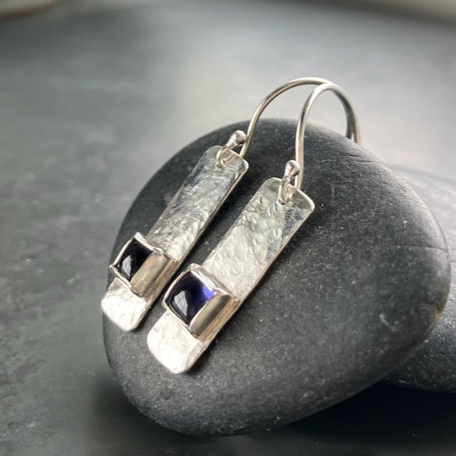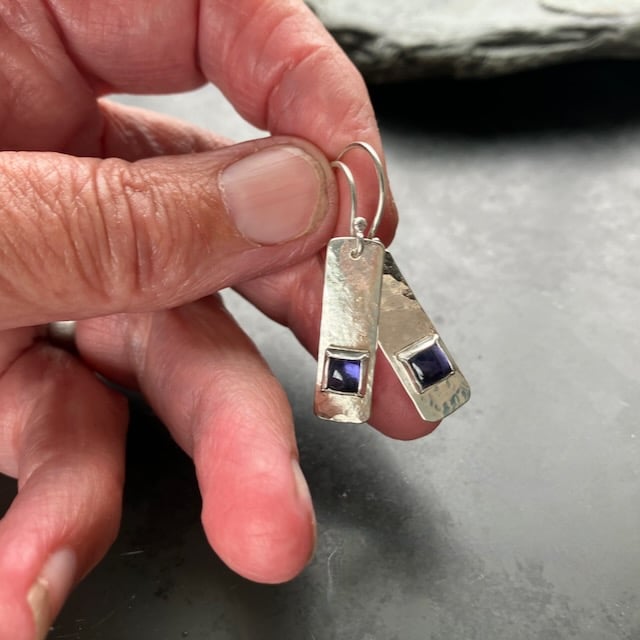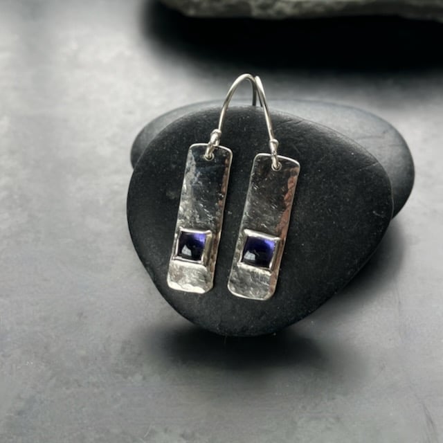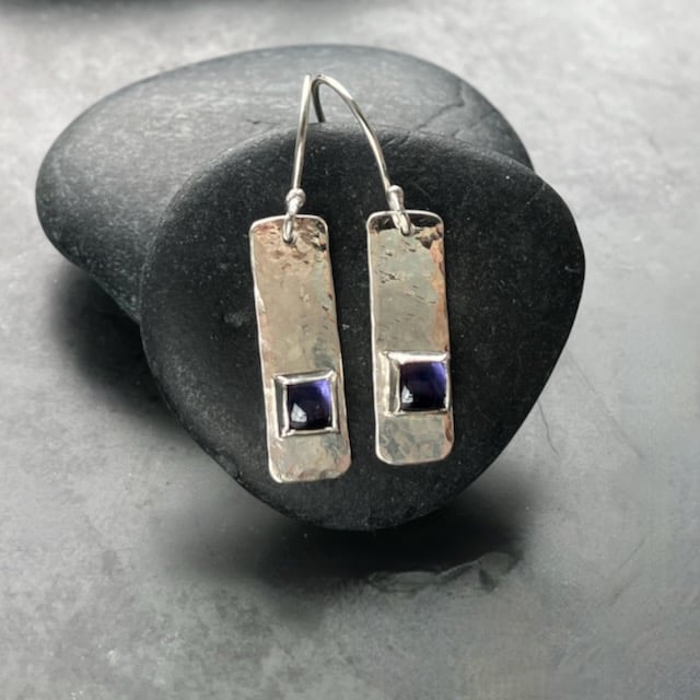 I have made these rectangular earrings with a beaten texture which reflects the light beautifully. They have a 4 mm square inky blue iolite cabochon set towards the bottom of the bar. I have hand made the ear wires. The bar measures 2.5cm x 7mm. They will be nicely presented in one of our written in silver boxes and sent first class.