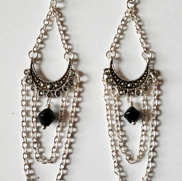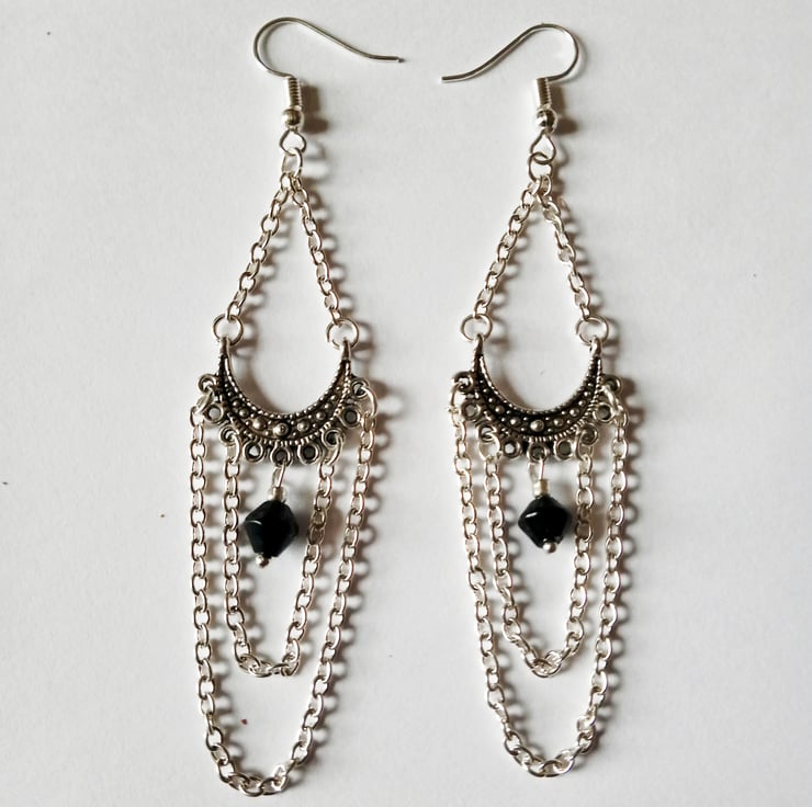 These beautiful earrings have chandeliers with hanging chain and black crystal detail. They hang on silver plate hooks.
