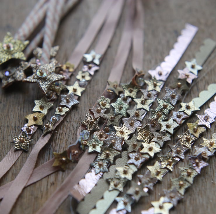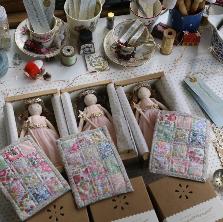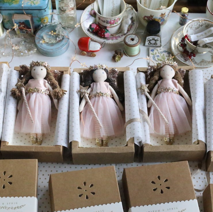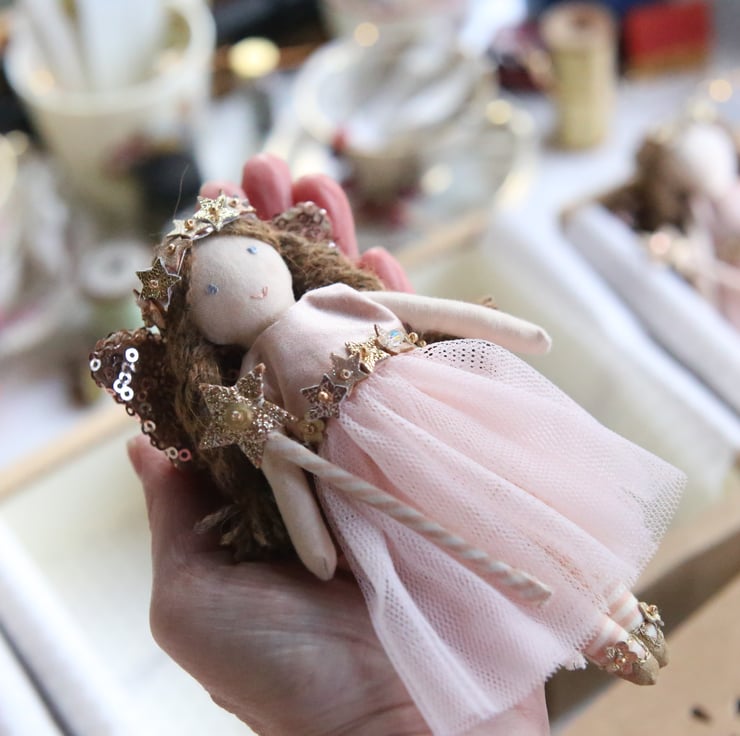 She measures approximately 15cm and is wearing a removeable dress made from silk and tulle. She has a little crown and sash made from leather stars hand punched from a selection of metallic shades, each individually attached with a gold bead. She has sequin wings and a little star wand. She is made from cotton and has stripy legs. Hair and eye colour to be personalised as requested. Her shoes are painted with gold fabric paint and embroidered with a tiny chain stitch.