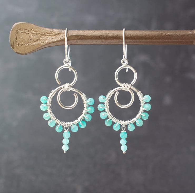 Silver dangle earrings featuring an elaborately swirling 'S' design wrapped with silver wire thread and adorned with tiny faceted gemstone beads of amazonite. All hung from handcrafted sterling silver ear wires.