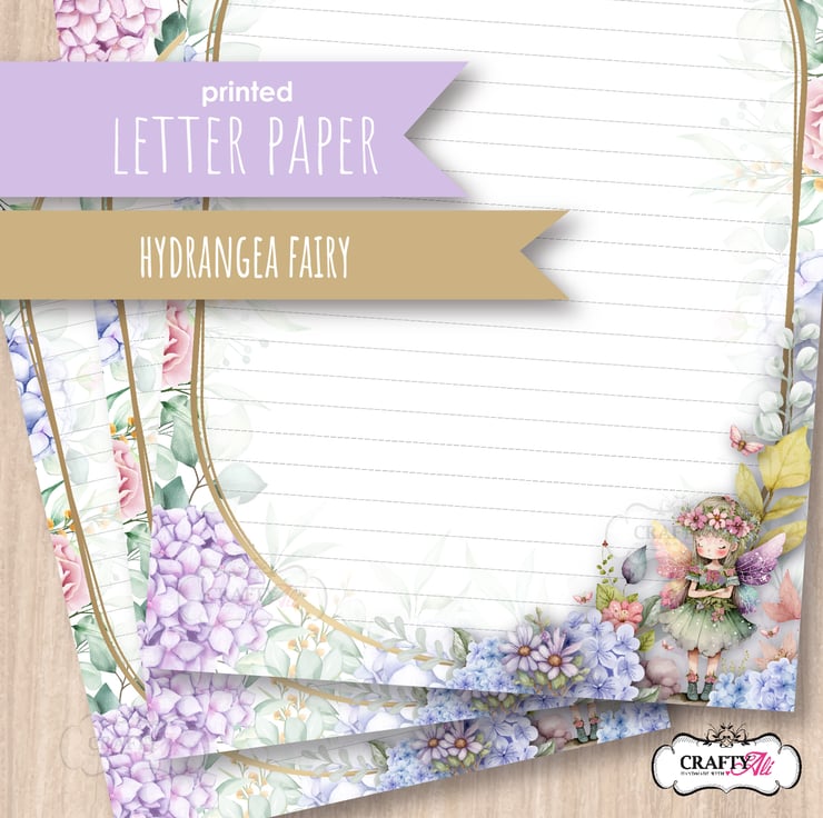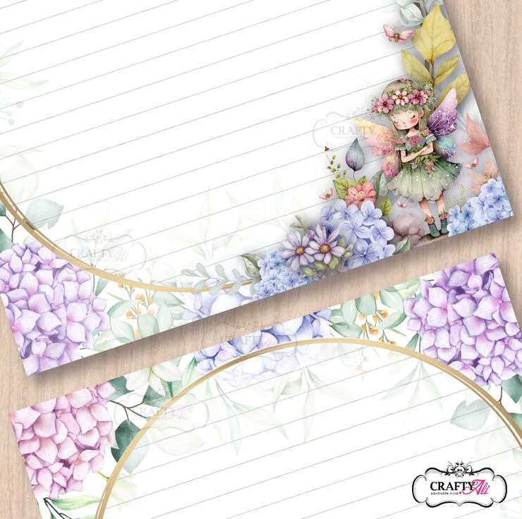 A set of 10 sheets of A5 size handmade letter writing / notepaper set with a sweet little fairy surrounded by hydrangea flowers and an oval frame, in soft pastel colours. Whether you're penning a heartfelt love note, corresponding with a pen pal or sending a thoughtful 'thank you', our letter writing paper will enhance the experience for both sender and recipient!