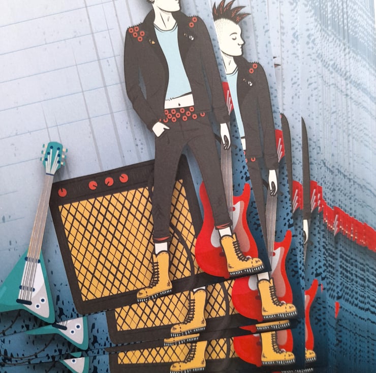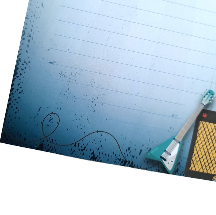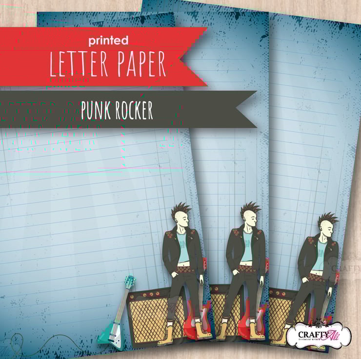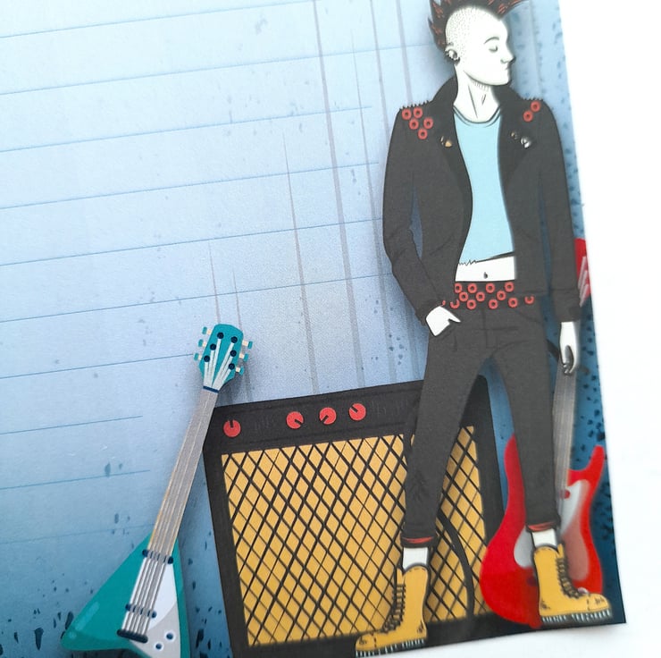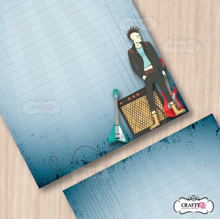 A set of 10 sheets of A5 size handmade letter writing / notepaper set with a cool punk rocker musician over a grungy blue background. Whether you're penning a heartfelt love note, corresponding with a pen pal or sending a thoughtful 'thank you', our letter writing paper will enhance the experience for both sender and recipient!