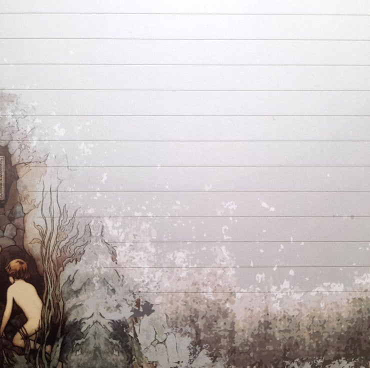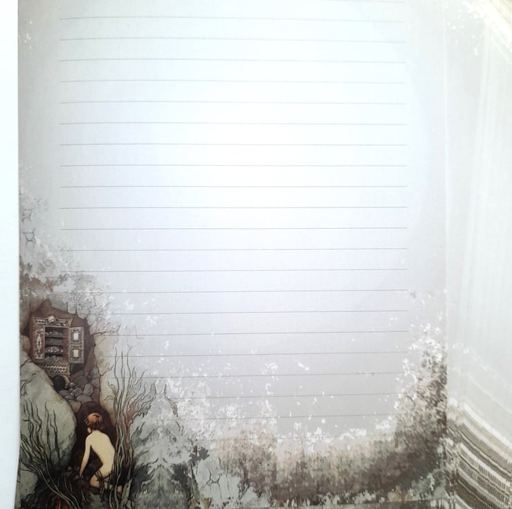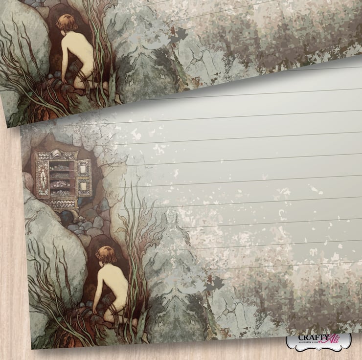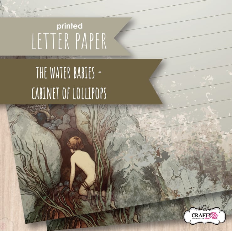 A set of 10 sheets of A5 size handmade letter writing / notepaper based upon the wonderful illustrations of the Water Babies, by artist Warwick Goble. This 'scene' is the Cabinet of Lollipops.