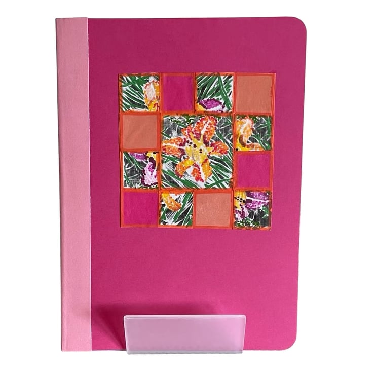 The paper and cover corners are rounded and the cover is decorated with a hand pieced collage motif using plain and hand tinted paper.