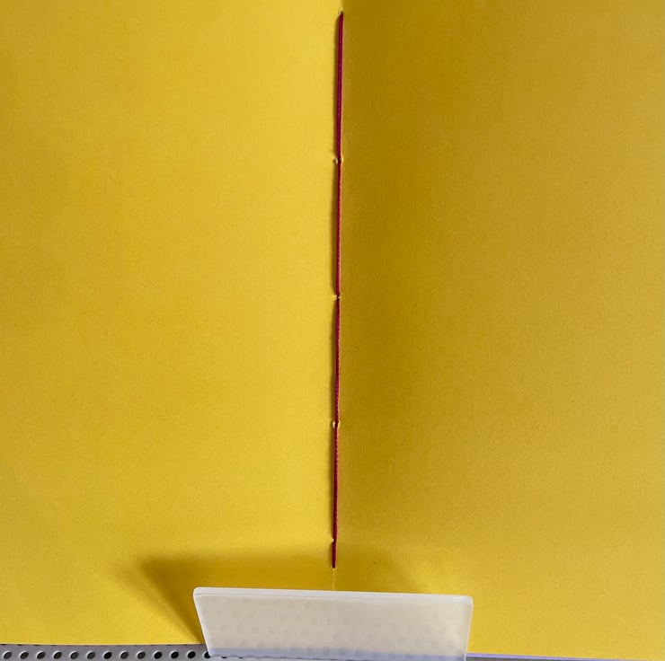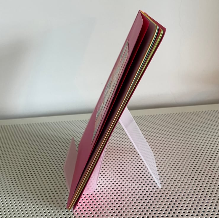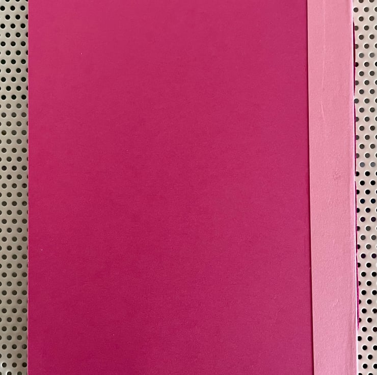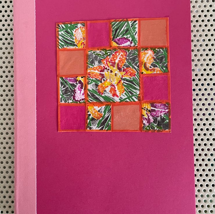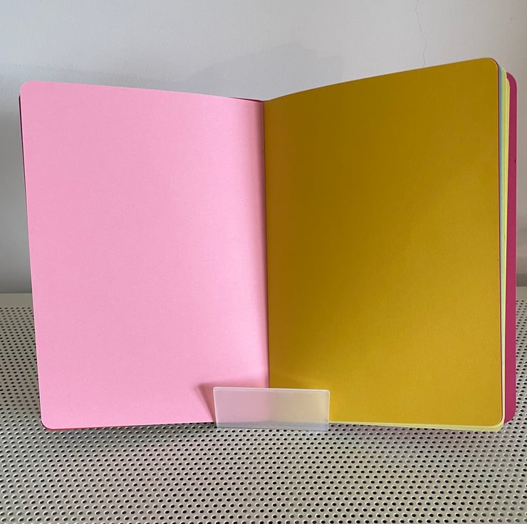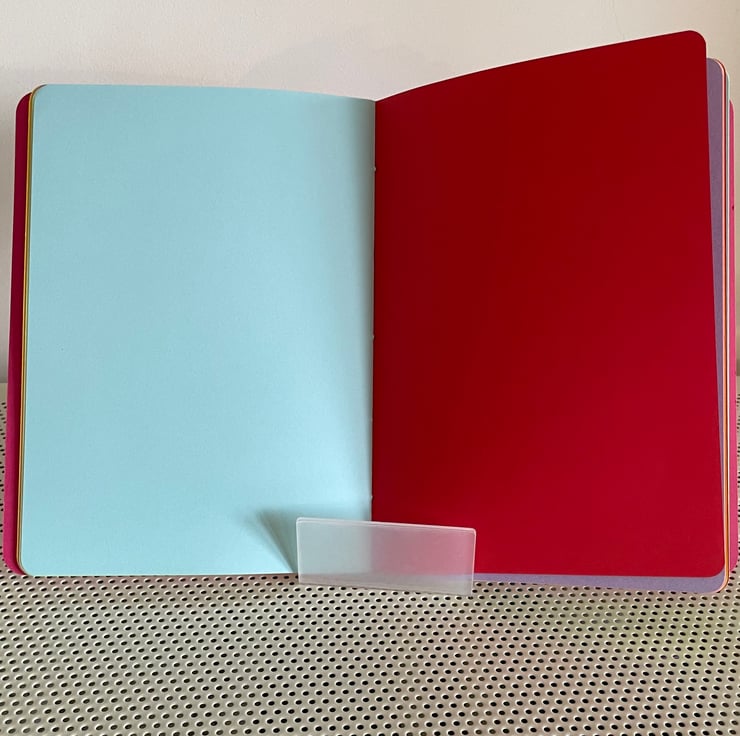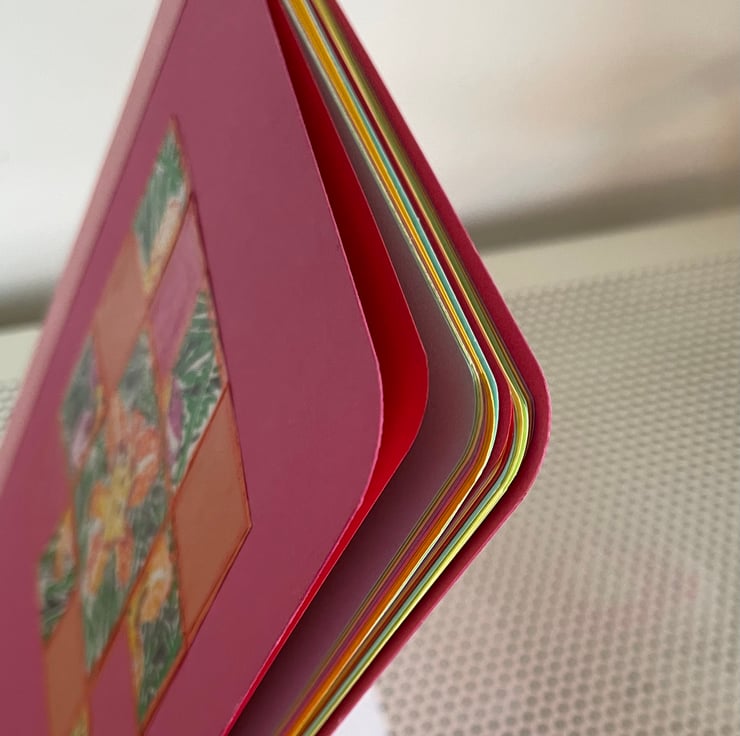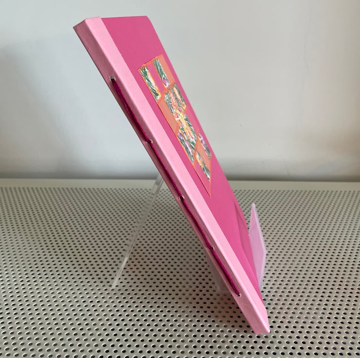 Approximately A5 sized this notebook is hand constructed from colourful card and paper. It contains two book blocks of coloured premium paper which are hand stitched to the spine.