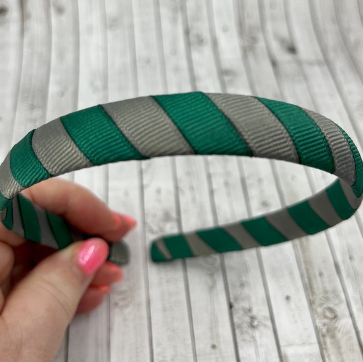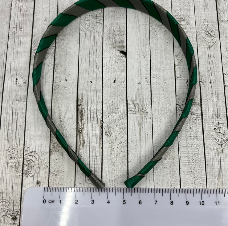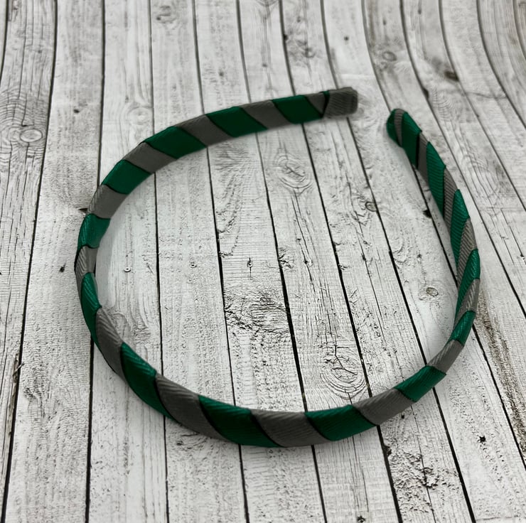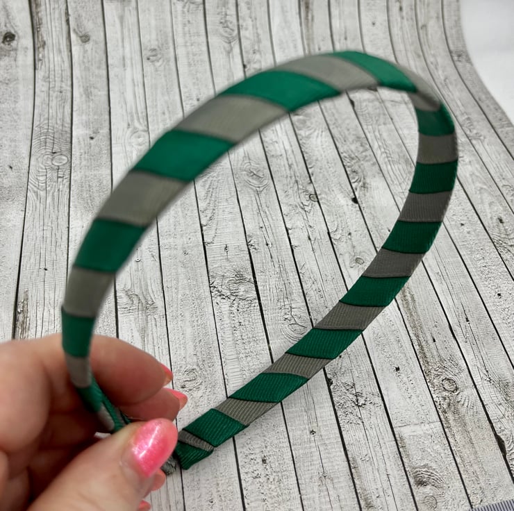 Our hunter green and grey Ribbon 1cm striped head band is made with excellent quality grosgrain ribbon. It will match beautifully with your little one's school Uniform and keep those little stray curls out of your little one's eyes.