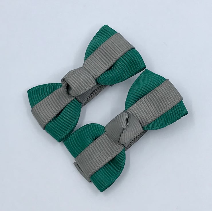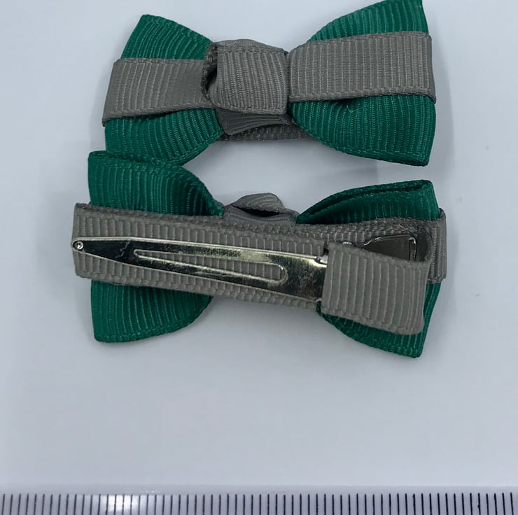 Our Itty Bitty clips are handmade here in our little shop. They are so cute and compliment any school Uniform with hunter green and grey in it. They are ideal for keeping those sneaky little curls from straying into your little one's eyes.