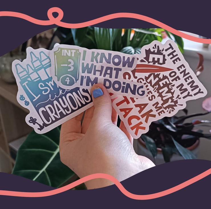 Waterproof, matt, permanent adhesive stickers roughly 80mm x 80mm - stick on your laptop, your water bottle, your dice tray, your DM screen - wherever you like!