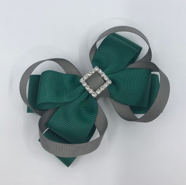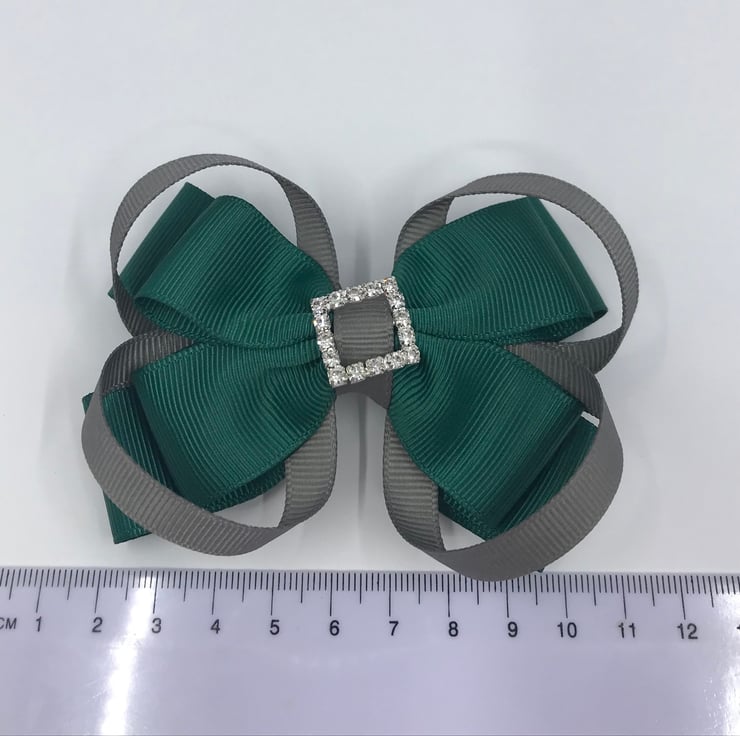 School Hunter Green Double Layer Bow with Grey Loops on Clip