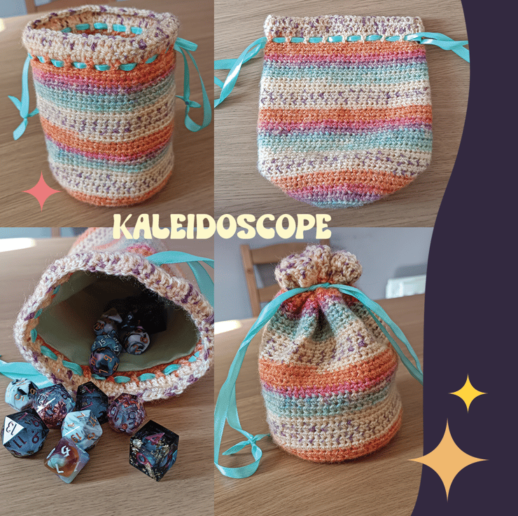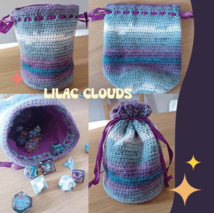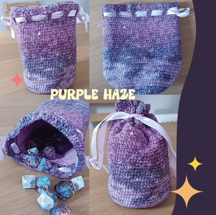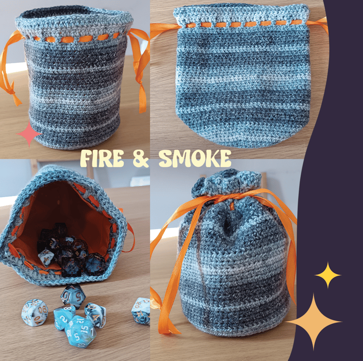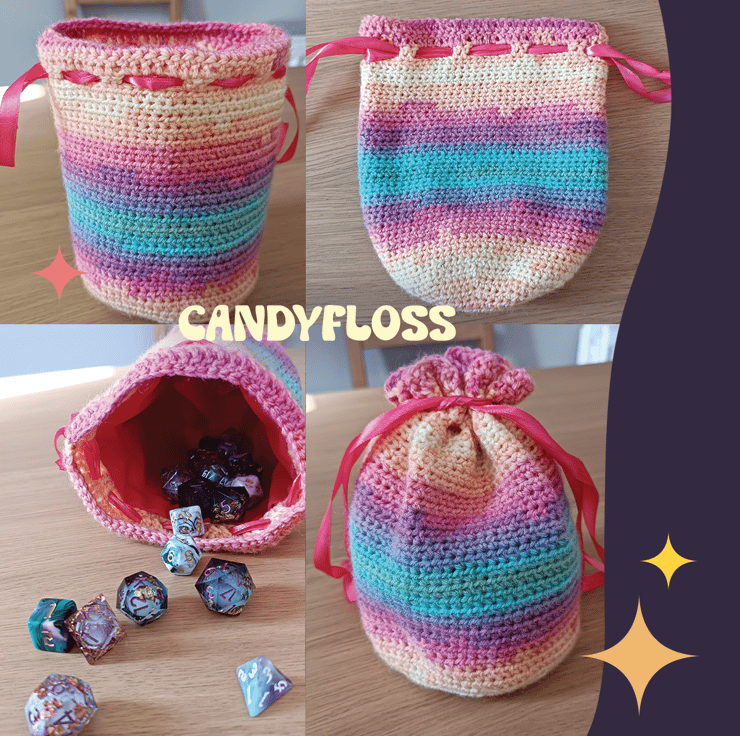 Perfect to hold dice hoards or trinket/potion collections - keep an eye out for colour schemes that fit your played character! I may be open to custom requests but cannot guarantee anything as it depends on time and yarn/fabric stock - send me a message if interested.