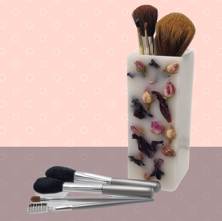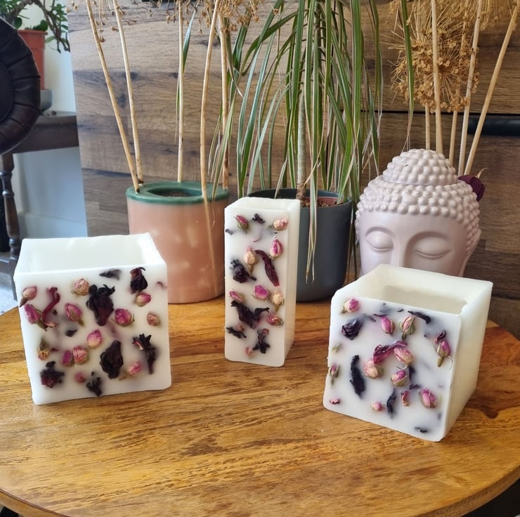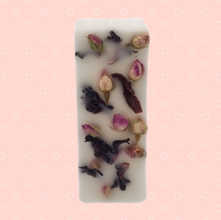 A beautiful oblong vase made from un-fragranced wax with dried rosebuds and hibiscus decoration on the front surface. Can also be used as a pretty container for items such as make-up brushes, pot-pourri, pens and pencils, crafting tools.