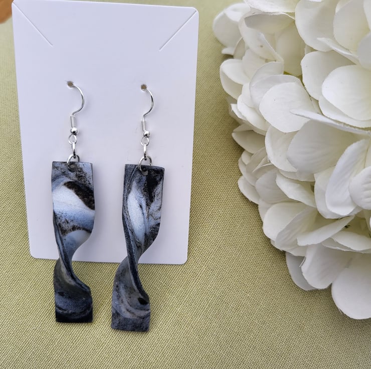 Unique design of black and grey metallic dangle earrings. Handmade from polymer clay. Silver plated hypoallergenic ear wires have been used for those with sensitive skin. The drop measures roughly 6 cm. would add a touch of pizzazz to any outfit day or night.