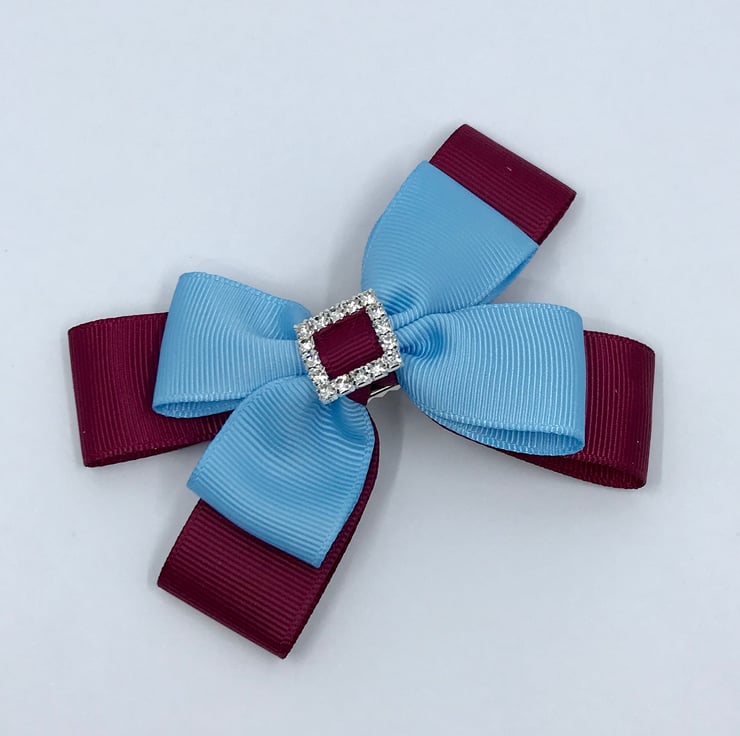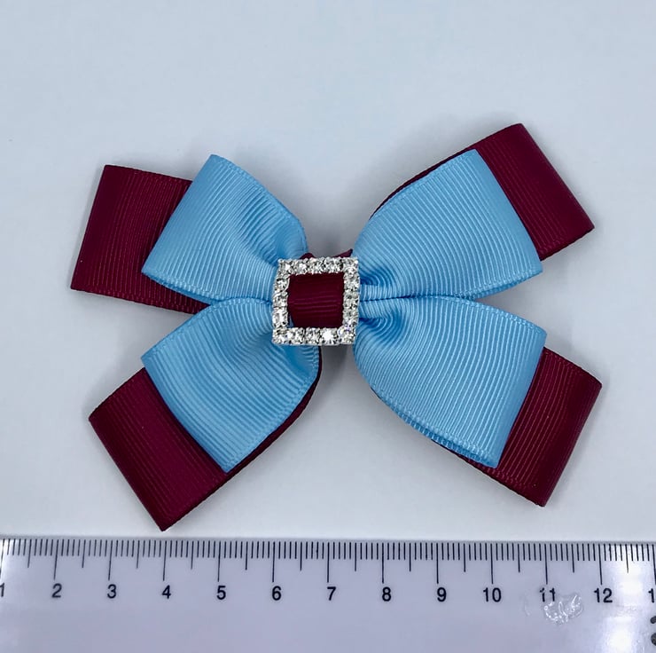 Our double bows are handmade here in our little shop. They are made from the best quality Grosgrain ribbon. These bows are really elegant and look extremely smart and go well with the wine and light blue School Uniform.