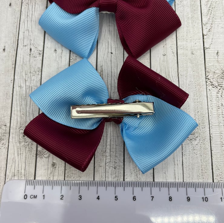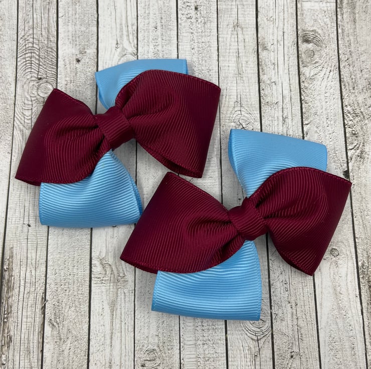 Our diagonal double bows are handmade here in our little shop. They are made from the best quality Grosgrain ribbon. These bows are simple and classic and look extremely smart and go well with the wine and light blue School Uniform.