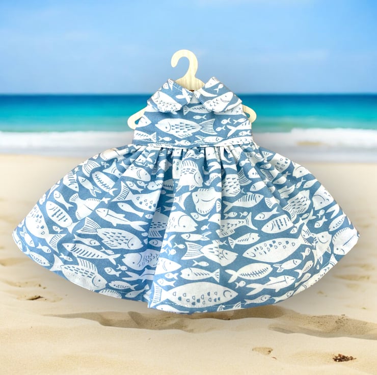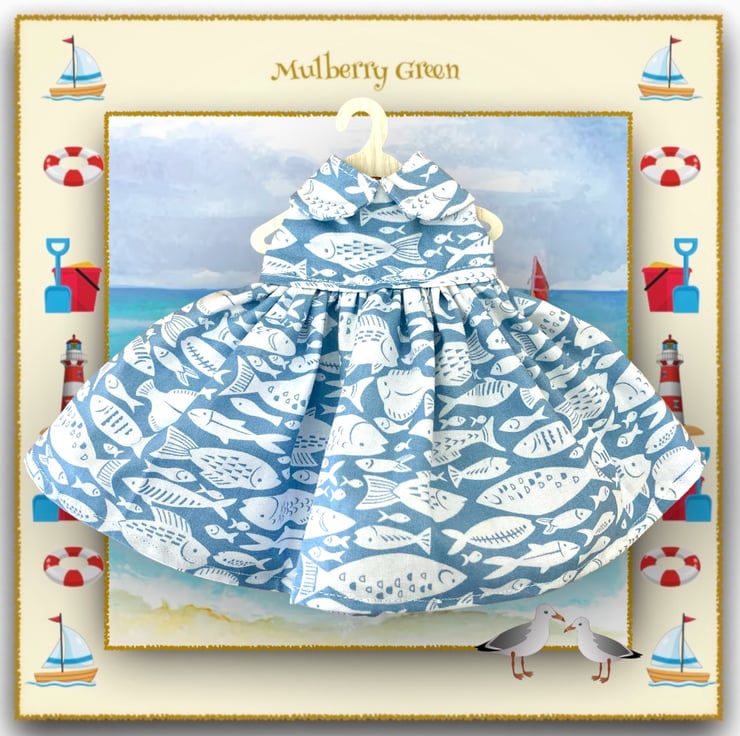 A pretty little silver grey dress in a fishes print, to fit the Mulberry Green characters. The dress has a Peter Pan collar and a lined bodice. Perfect for the seaside.