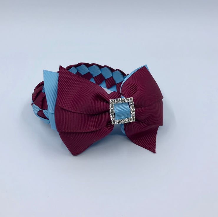 Our wine and light blue Bunwrap is handmade here in our little shop. It is made from the best quality Grosgrain ribbon. The Bunwrap is really elegant and look extremely smart wrapped around your little one's bun. It clips in at the front of the bun then the tail wraps around the bun and clips beneath the bow at the front to complete the look, tail is 21 cm.
