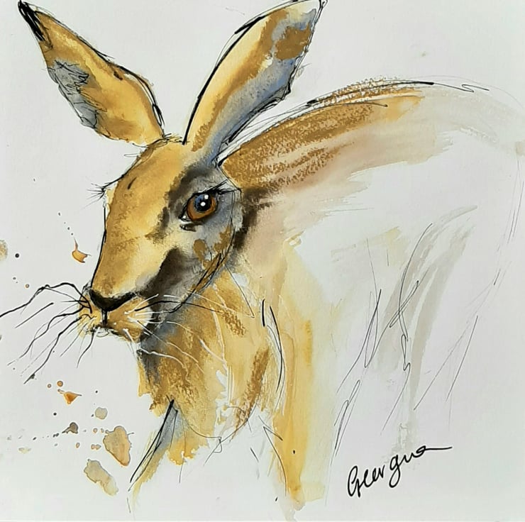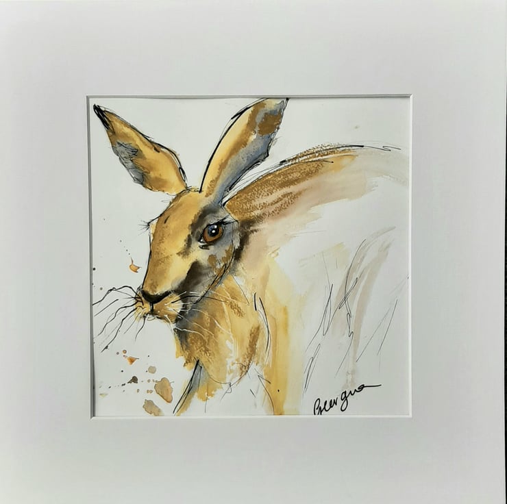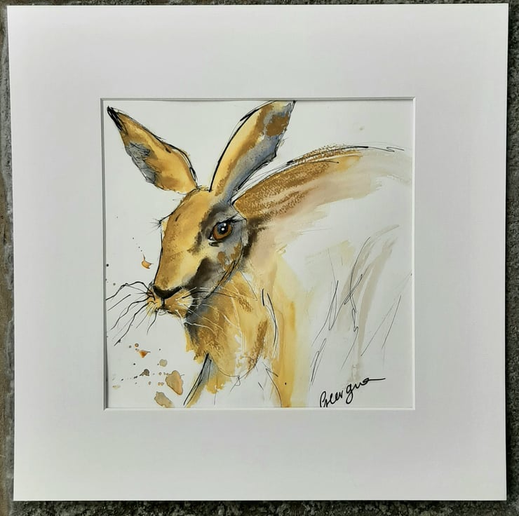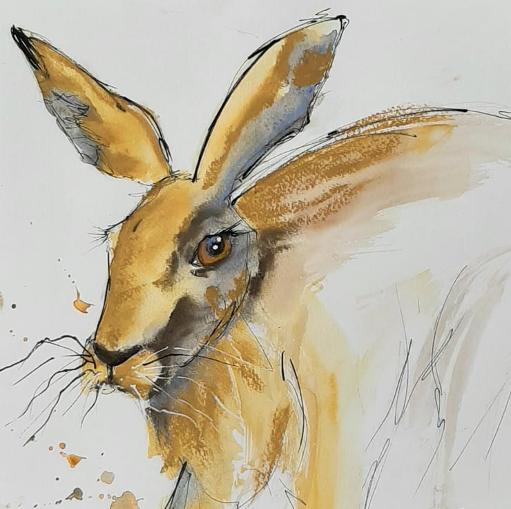 Original mixed media piece of a running hare. A loose, expressive work created using ink, watercolour charcoal and pastel. Painted in the west of Scotland.