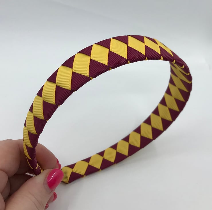 Our Diamond pleated hairbands are handmade here in our little shop. They are so cute the could compliment any school Uniform with wine and yellow gold in it. They are ideal for keeping those sneaky little curls from straying into your little one's eyes.