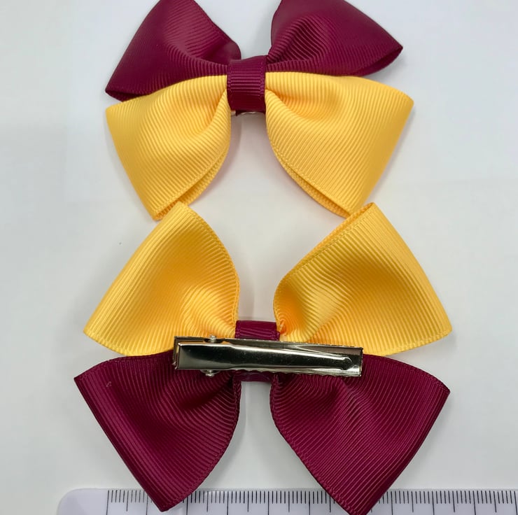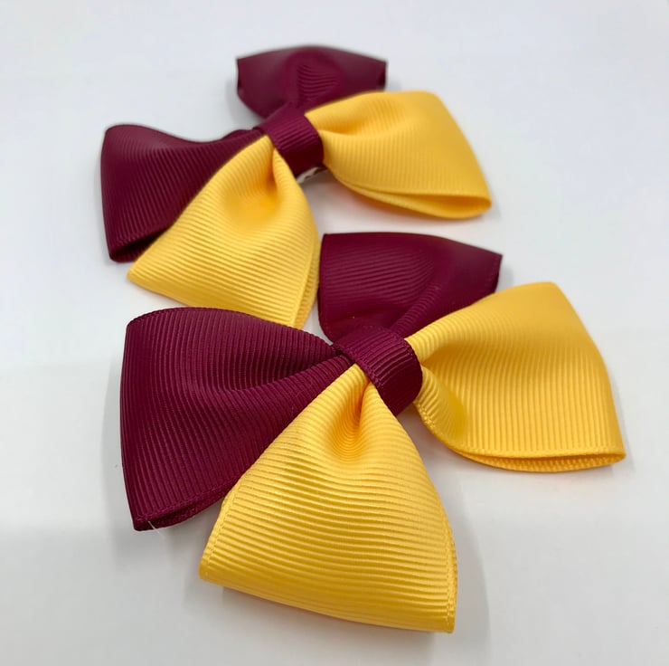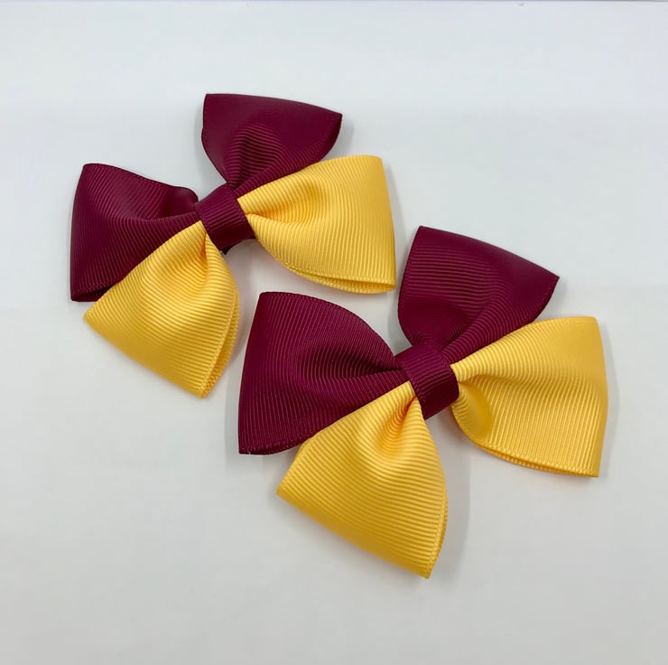 Our two tone double bows are handmade here in our little shop. They are made from the best quality Grosgrain ribbon. These bows are simple and classic and look extremely smart and go well with the wine and yellow gold School Uniform.