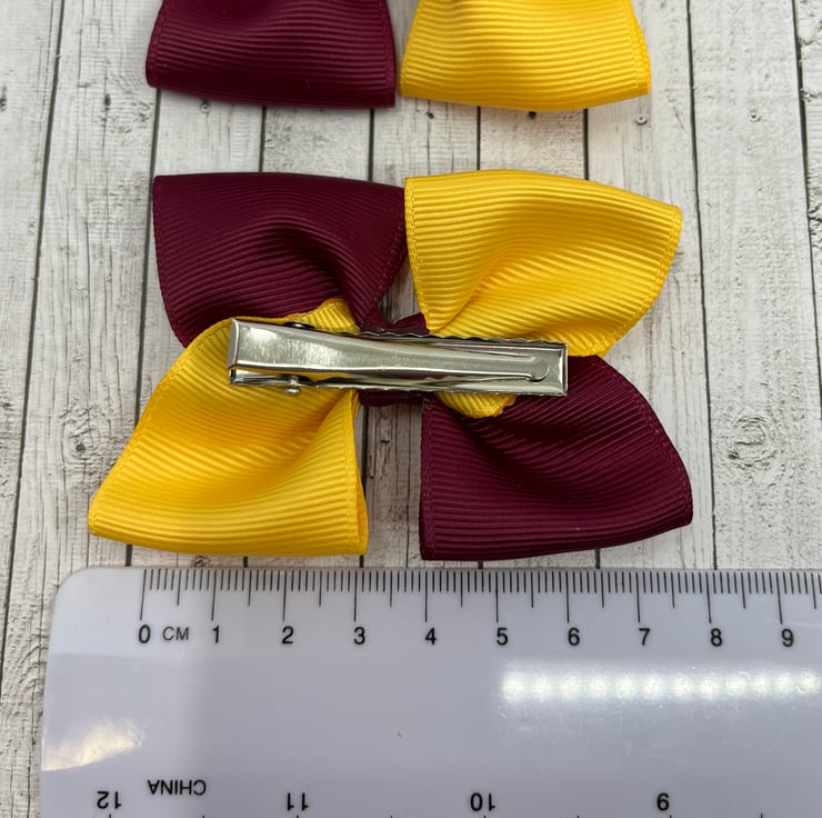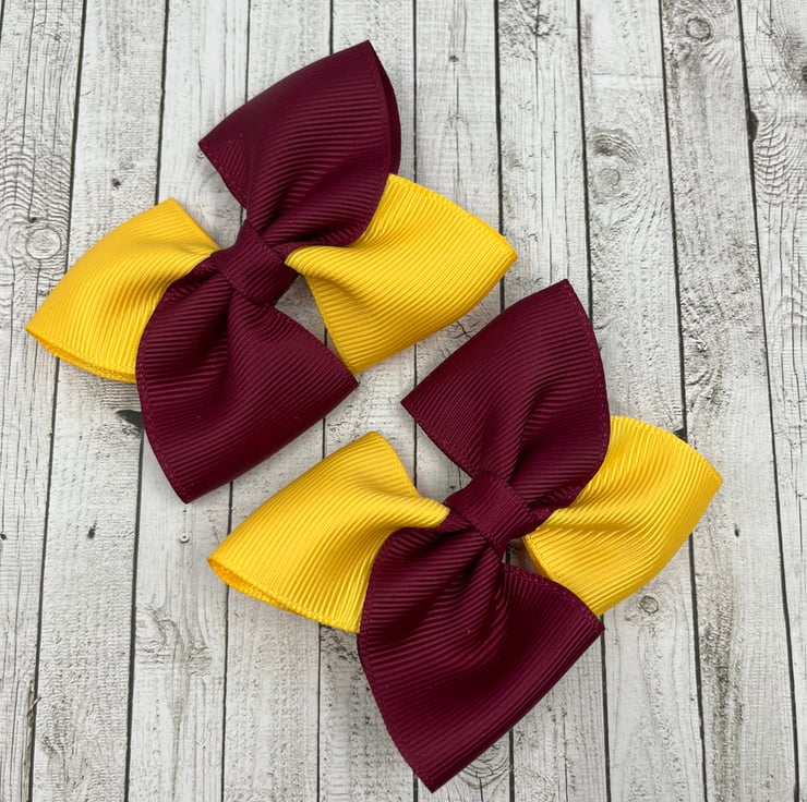 Our square double bows are handmade here in our little shop. They are made from the best quality Grosgrain ribbon. These bows are simple and classic and look extremely smart and go well with the wine and yellow gold School Uniform.