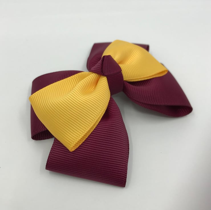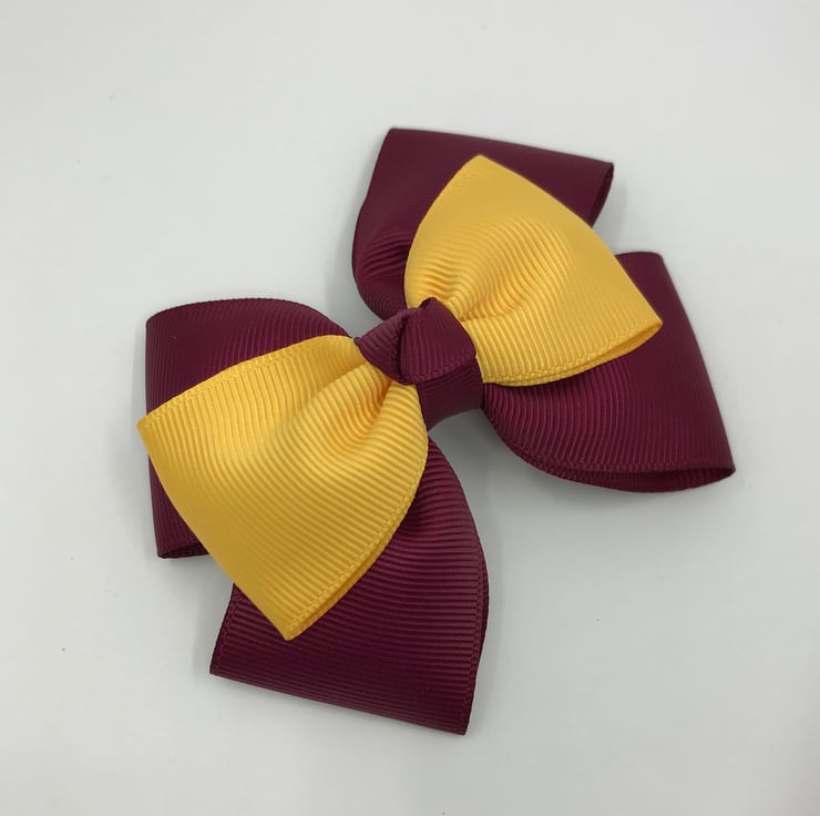Our top knot bows are handmade here in our little shop. They are made from the best quality Grosgrain ribbon. These bows are really elegant and look extremely smart and go well with the wine and yellow gold School Uniform.