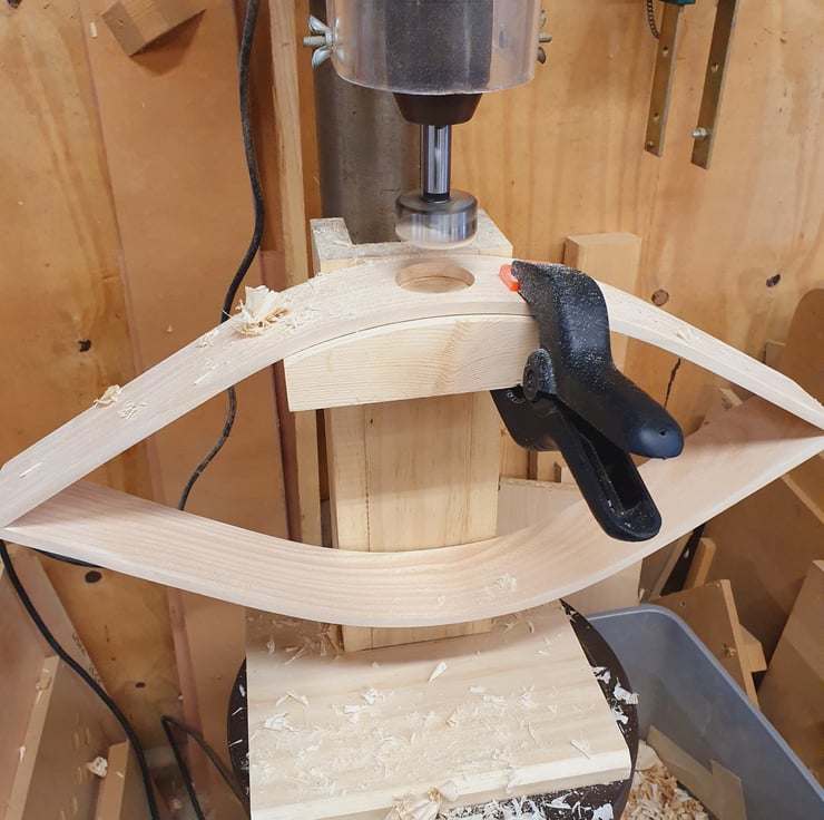 Experimenting with the steam bending process created this shape around a rough former, crudely created in the workshop. Seeing its potential, I made a better former and made jigs to join the pieces together. My young son was instrumental in the naming of the Blink due to the resemblance to an eye.