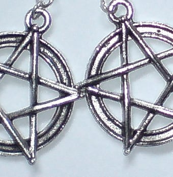 Thee nice earrings have large pentagram charms hanging on silver plate hooks.